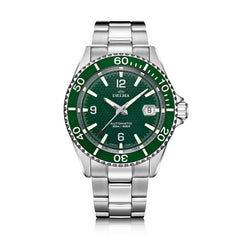 ステンレス・スティール・ケース / セラミックケース 裏蓋: ステンレス・スティール、シースルーバック ベゼル: アノダイズドアルミベゼル、逆回転防止ベゼル ガラス: サファイア・クリスタル (反射防止加工) 文字盤: グリーンダイアル、アプライドインデックスに蓄光塗料付き、日付表示 ストラップ: ステンレス・スティールブレスレット |