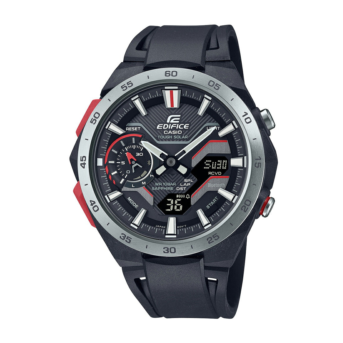 Bluetooth ® によりスマートフォンアプリと接続し、正確な時刻表示を実現する自動時刻修正、約300都市から簡単に都市選択できるワールドタイム、1/1000秒単位のストップウオッチ計測データのスマートフォン転送、時計ボタンの長押しによりスマートフォンを鳴らす携帯探索機能などを可能にしています。