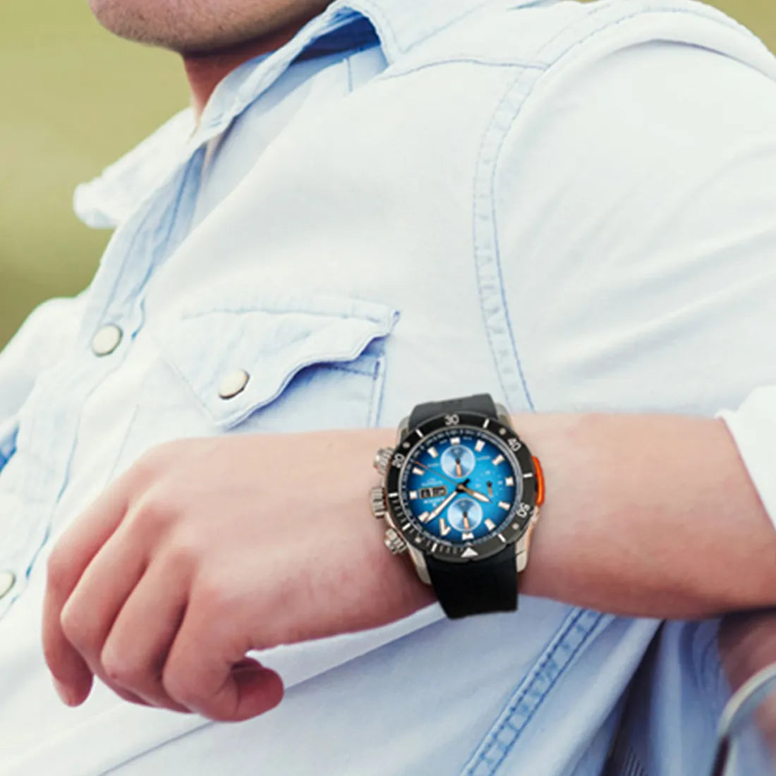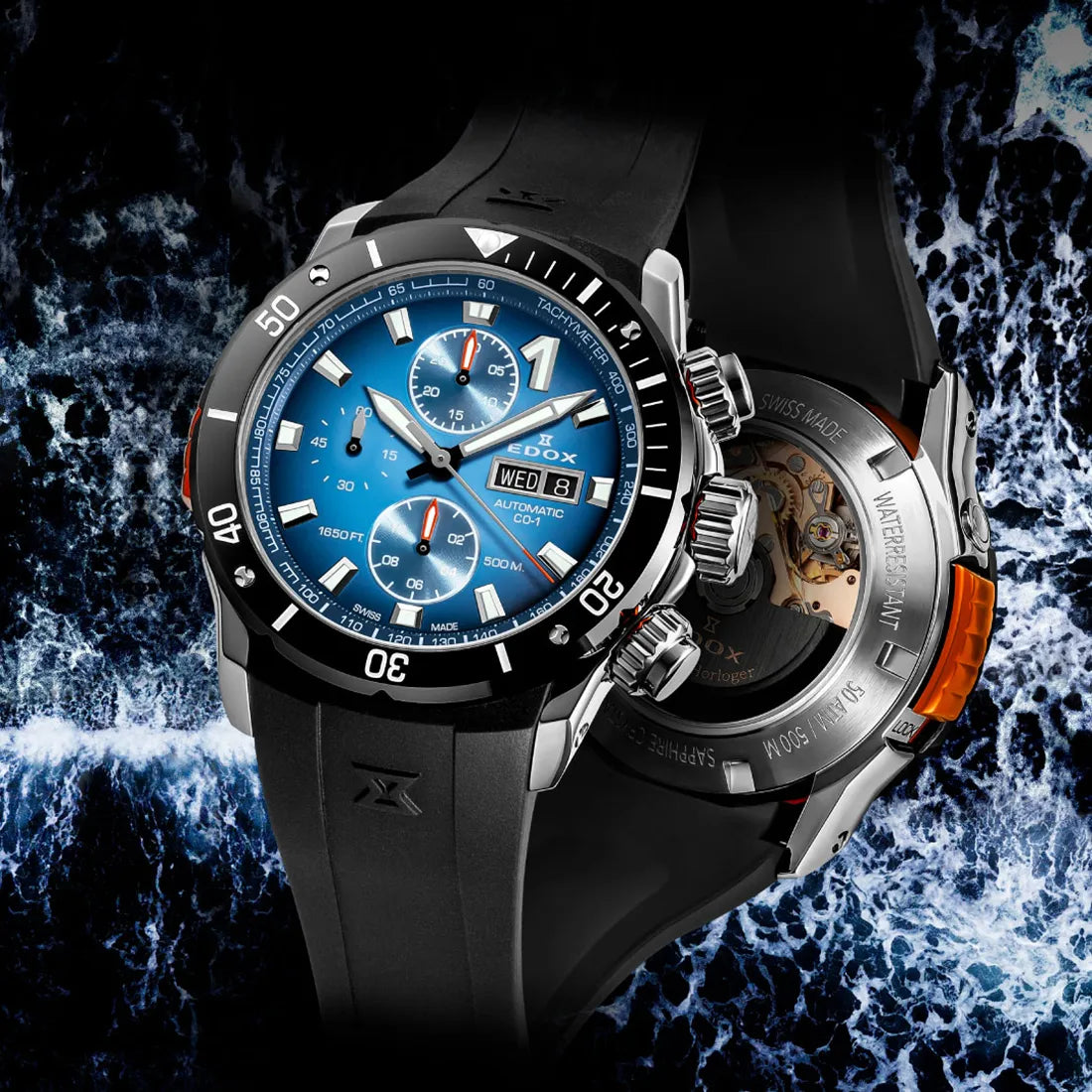 パワーボートレースのタフでダイナミックな世界観を表現した、機能性と防水性に優れたダイバーズウォッチ。