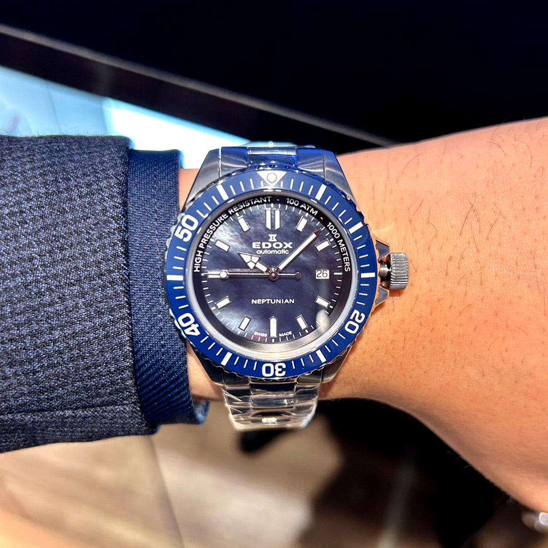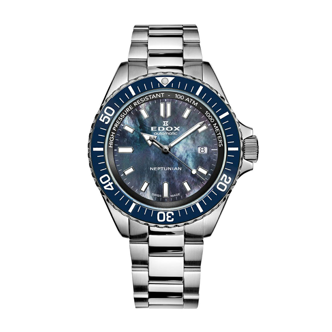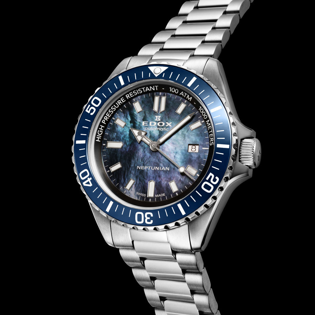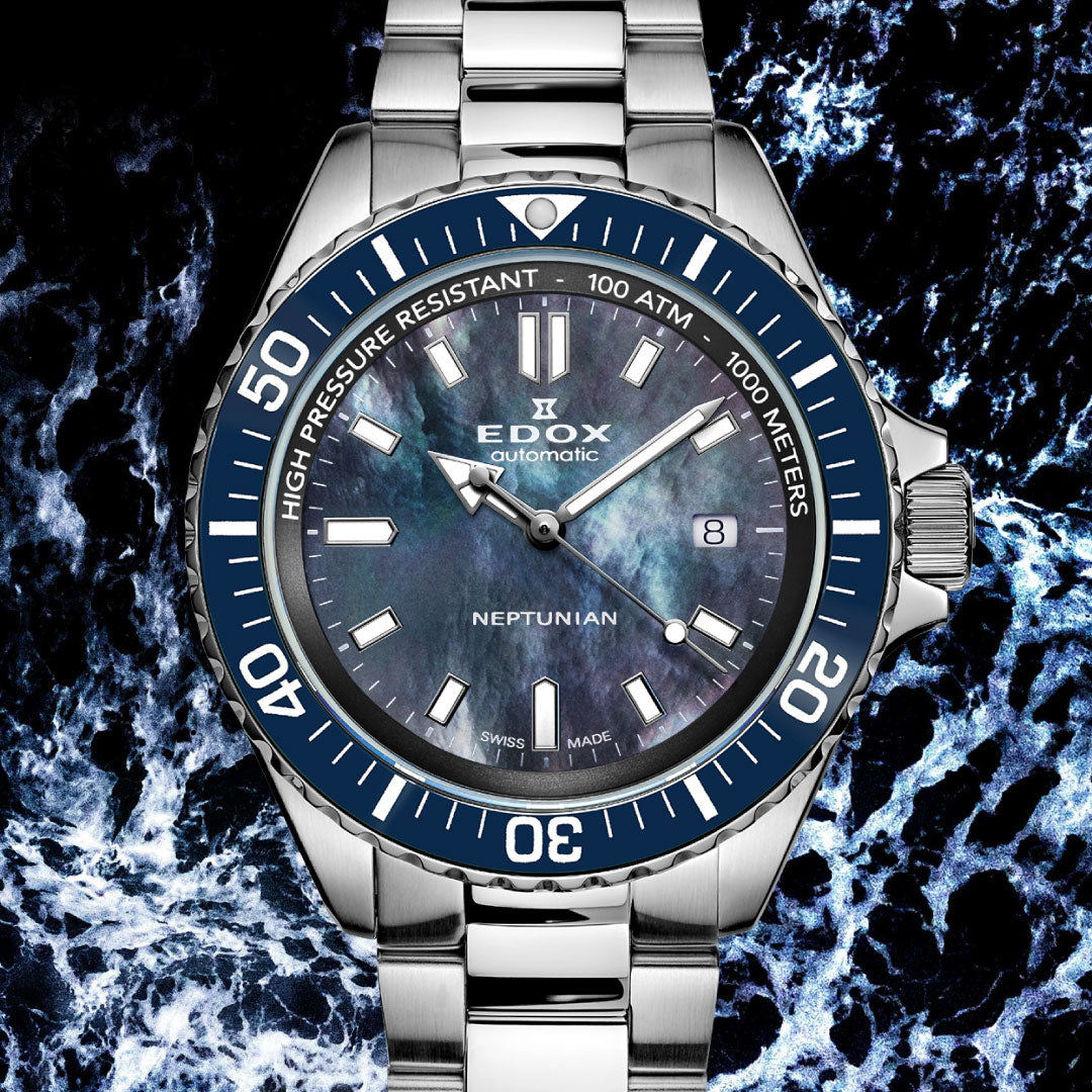 裏蓋に刻印された海の神・ネプチューンのモチーフは、エドックスならではのディティールです。