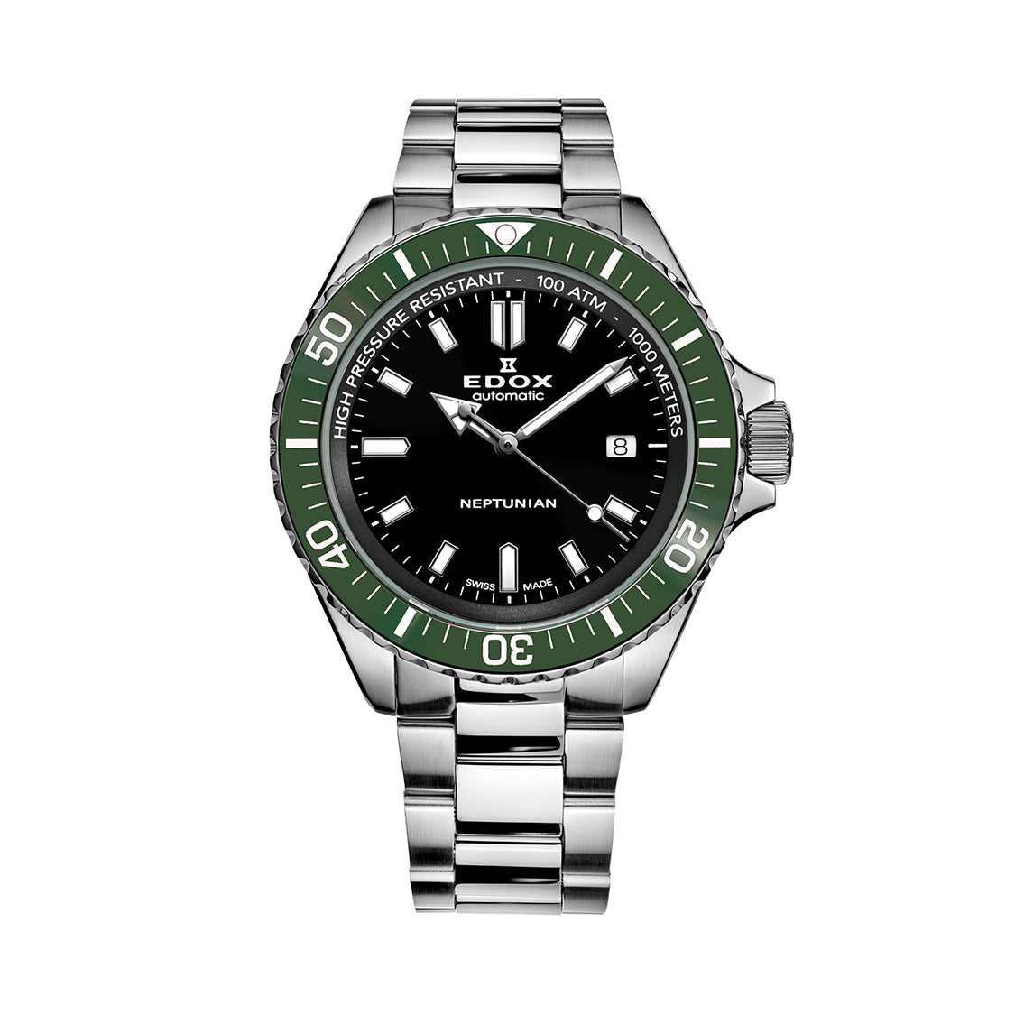 飽和潜水1000m防水を備え、セラミックベゼルと3mmの厚みがあるサファイアクリスタルガラスが時計の表面を保護。スマートな印象を与えるバータイプのインデックスを採用し、スーパールミノバ「X1」を塗布することにより水中など暗所での判読性を確保しています。また、ケースバックには、海の神ネプチューンのモチーフを刻印しています。