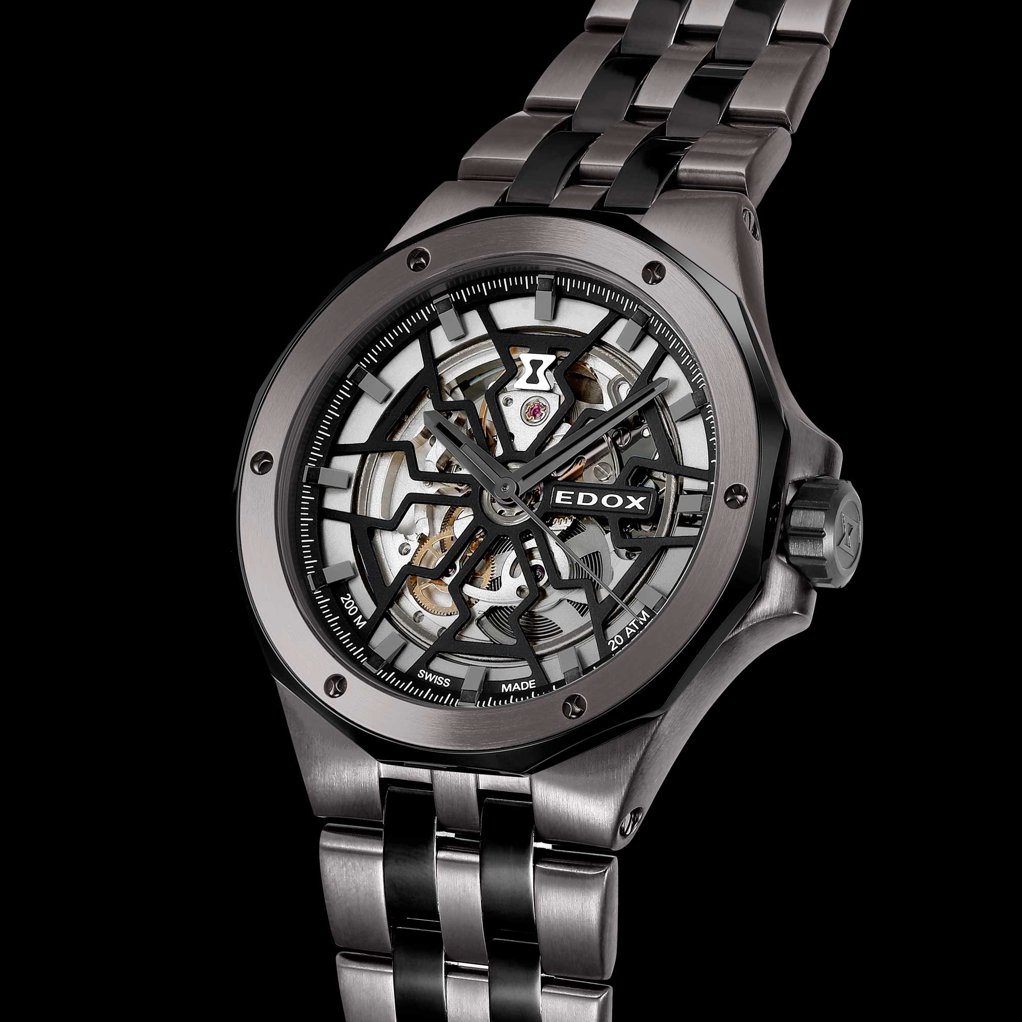 1961年に発売された「デルフィン」は、エドックスが特許を取得したダブルОリングと、衝撃吸収のための特殊な内部構造を持つ丈夫で特殊なケースにより、ねじ込み式リューズを解除した状態で200m防水を実現しました。この画期的なシステムを開発したエドックスは、“The Water Champion”というスローガンを掲げ、信頼性の高い防水時計のブランドとして広く認知されることになりました。ブランドの原点とも言えるヘリテージコレクションです。