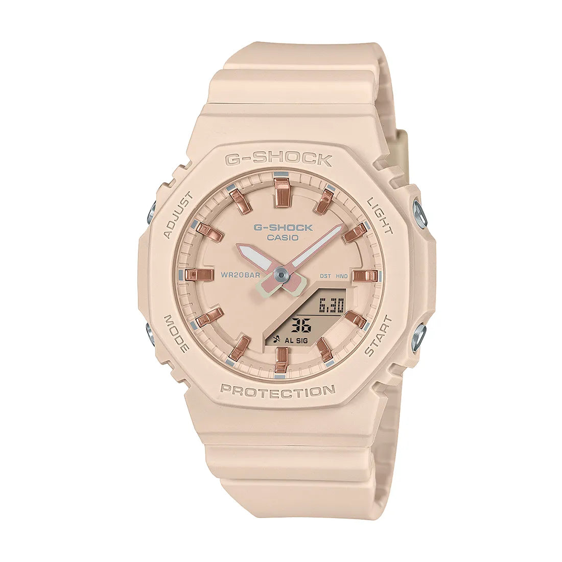人気のアナログ・デジタルコンビネーションモデルGMAP2100にピンクゴールドの蒸着インデックスが上品に輝く新色が追加されました。カラーはどんなコーディネートにも合わせやすいネイビー、ベージュピンク、ホワイトの3色。季節を問わず着けやすい3色をラインアップしました。また、コンパクトなサイズで腕の細い方も快適に着用できます。
