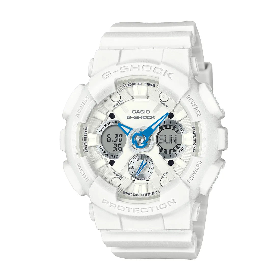 立体パーツで凹凸感を強調したユニークな文字板を、爽やかなホワイトのワントーン仕上げに。針にもホワイト蓄光を施しました。オレンジやブルーのアクセントカラーが、夏らしい開放感を演出します。ベゼル、バンドの主な樹脂パーツにバイオマスプラスチックを使用。原料に再生可能な有機資源を使うことで、環境負荷低減への貢献が期待されています。