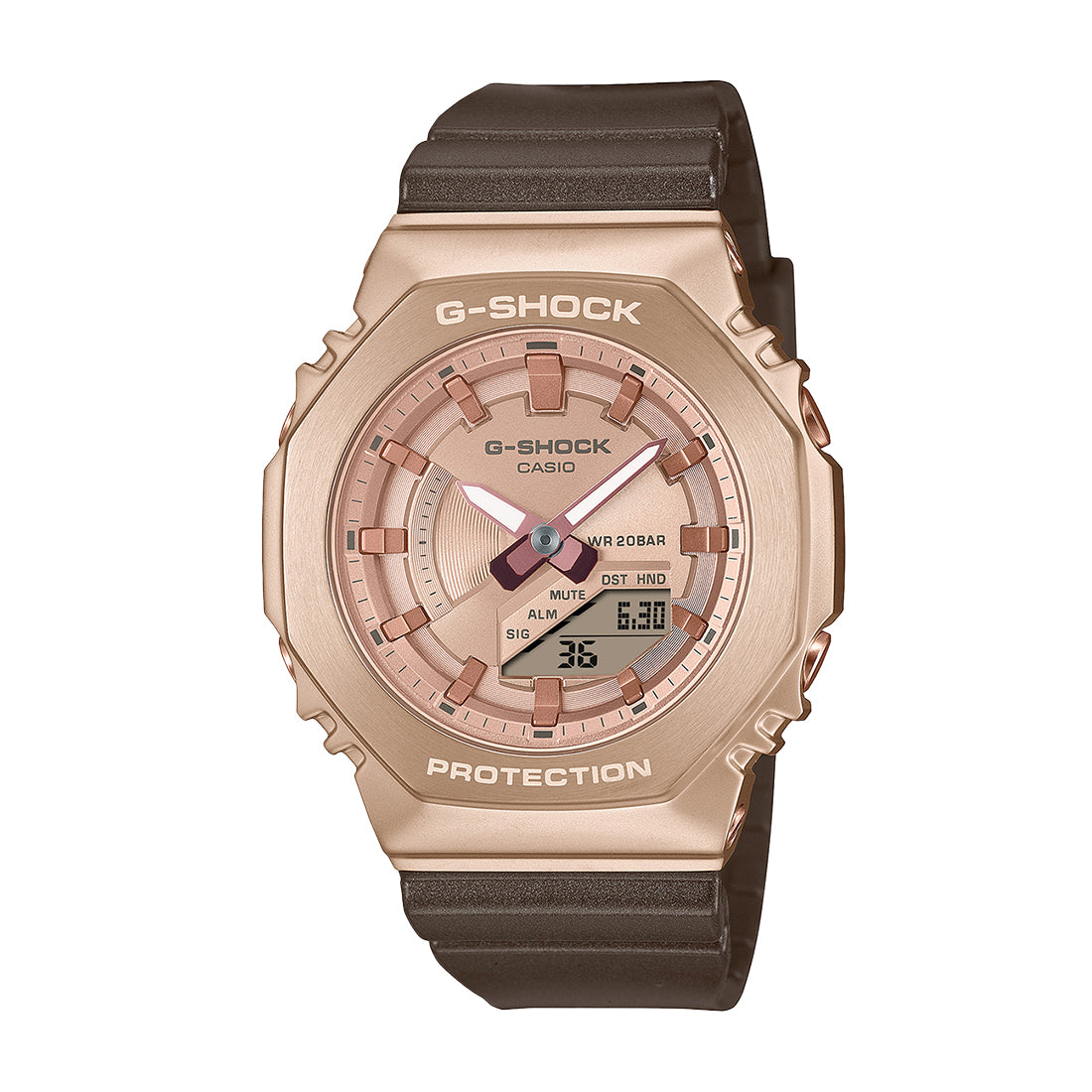 ベースモデルは、メタルカバードのGM-2100を小型化したGM-S2100。 ベゼル、文字板には肌馴染みの良いピーチゴールドのIPを採用し、上品な印象に仕上げました。バンドにはパール塗装を施すことで上品で質感のある輝きを実現。ベゼルの天面とサイドにはヘアライン加工を施し、その他のパーツにはハーフホーニング加工を施すことで落ち着いた印象を与えます。