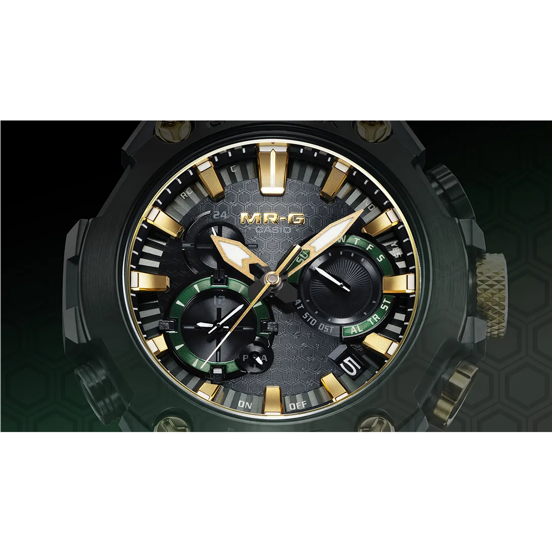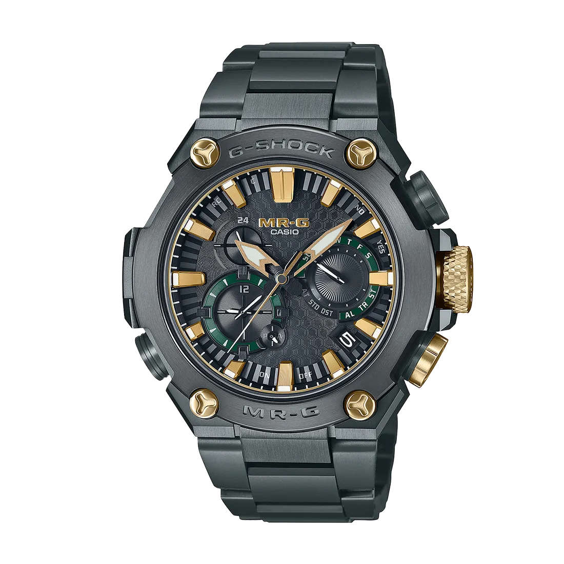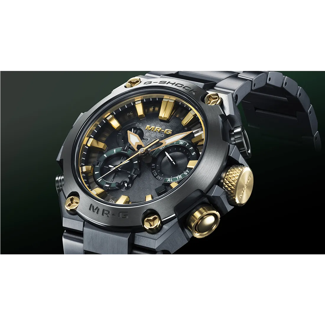 G-SHOCK最上級ラインのMR-Gシリーズ。MRG-B2000は、構造、機能、素材、仕上げなど細部までこだわり、日本古来の強さや美意識を継承しています。日本の伝統色「鐵色(くろがねいろ)」をテーマにデザインし、甲冑の素材である鉄を熱した際に現れる深い青緑色を、深層硬化処理とグリーンDLCコーティングを施したチタン外装で表現しました。