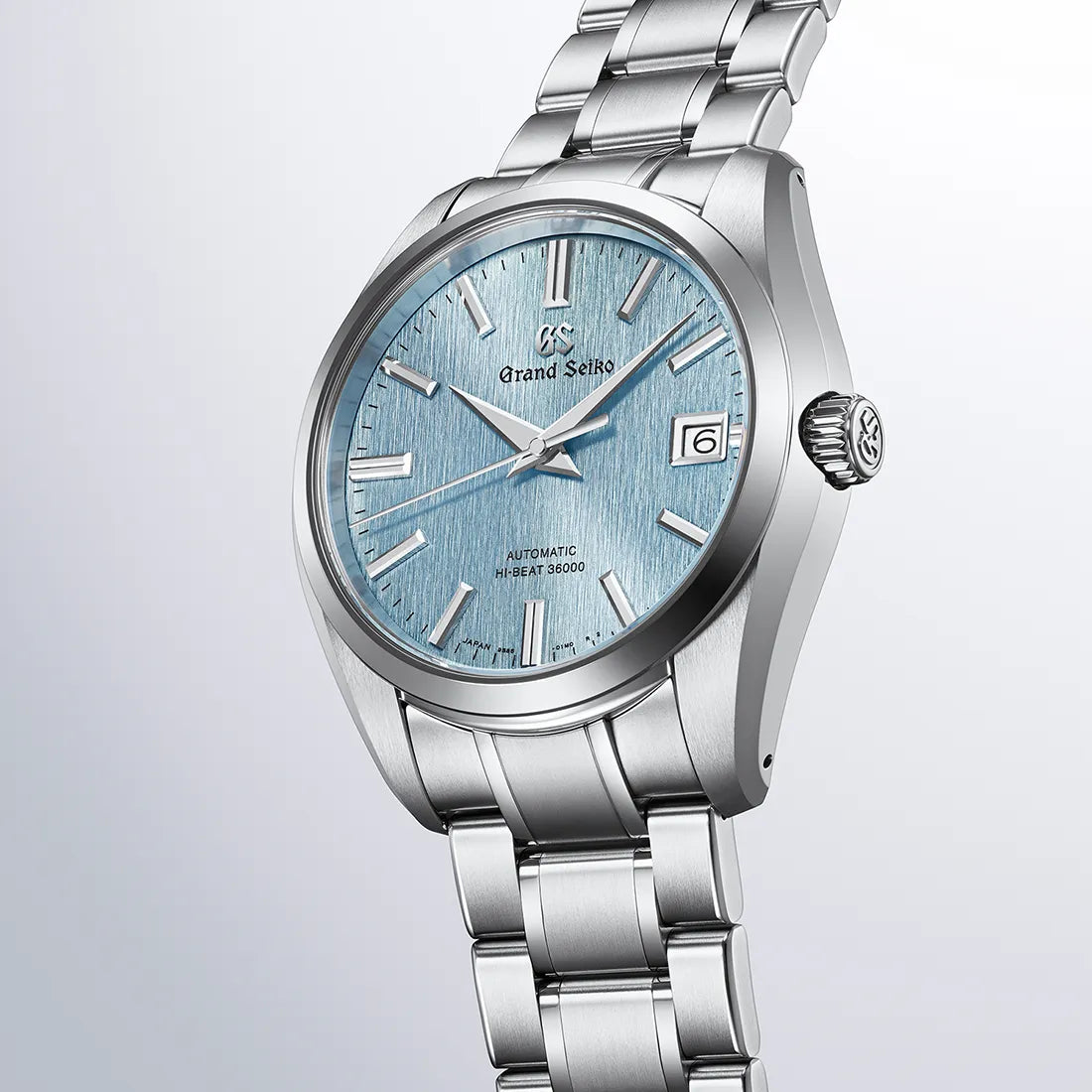 9Sメカニカルモデルの伝統的なスタイルを継承したケース径40㎜のモデルが「氷瀑」から着想を得たダイヤルで登場。「氷瀑」は、滝から流れる水が氷点下でゆっくりと時間をかけて凍りついていく自然現象。グランドセイコーの機械式モデルの製造元「グランドセイコースタジオ 雫石」から望む岩手山で厳冬期に見られる幻想的な光景を、ダイナミックさと繊細さが共存したパターンと独特の青白いカラーで表現しました。外装の素材には、ステンレススチールよりも軽量で錆びにくく、傷がつきにくいブライトチタンを採用しております。ムーブメントには毎秒 10 振動のハイビートムーブメント「キャリバー9S85」を搭載し、精度のばらつきを抑え、安定した精度を実現。