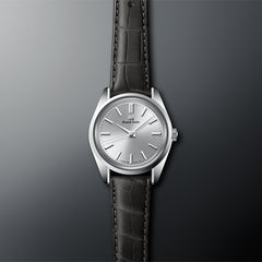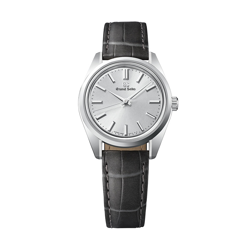 手巻ムーブメントのキャリバー9S64によって実現した小さめのケースに合わせた細めのインデックスと針が、多面カットによって美しくきらめきながら視認性を高めるとともに、端正なシルバーダイヤルを引き立たせます。ボックスガラスなど温かみを感じる要素も、このモデルの特徴です。
