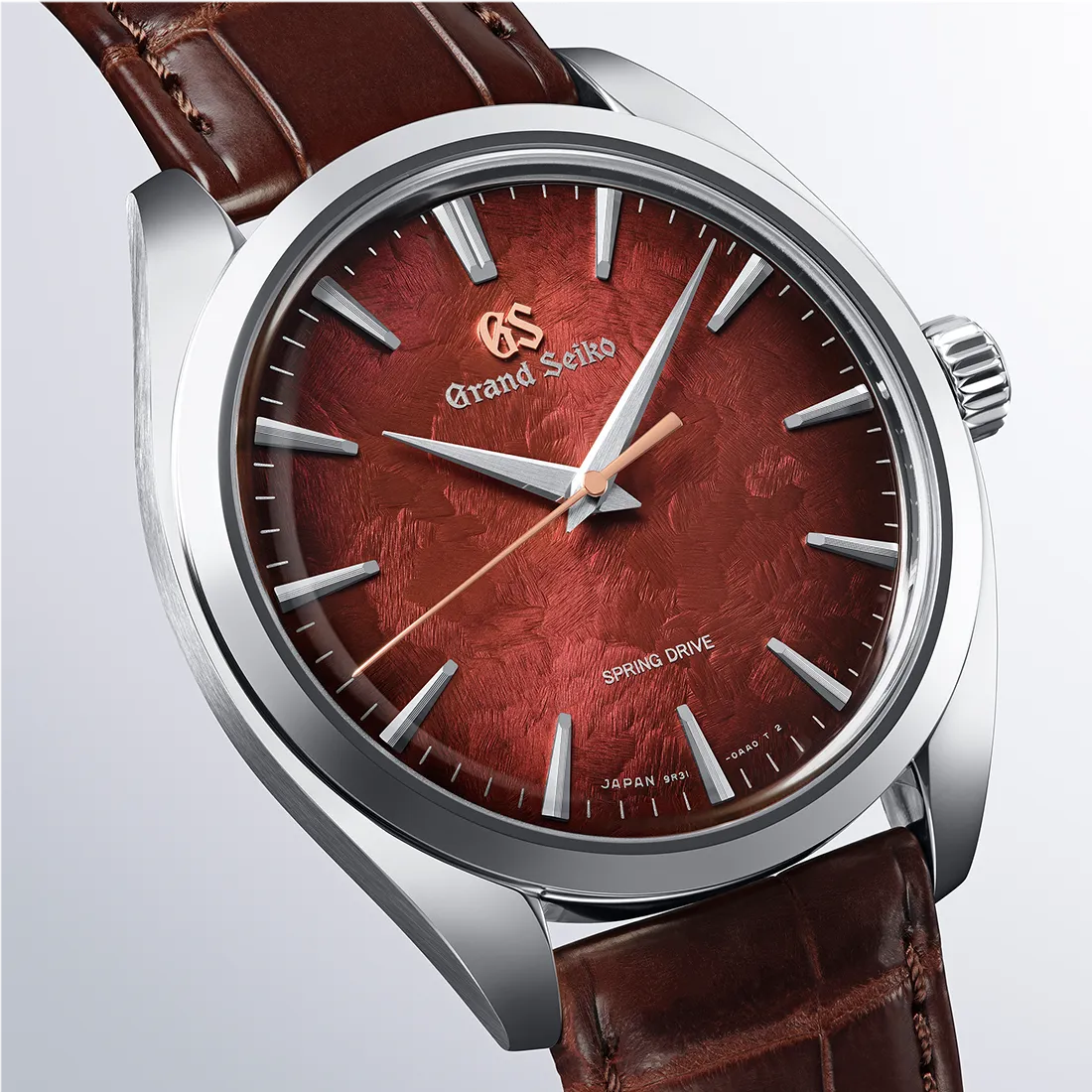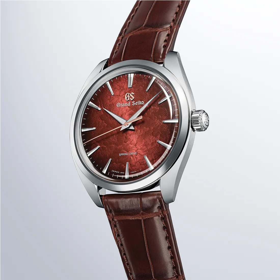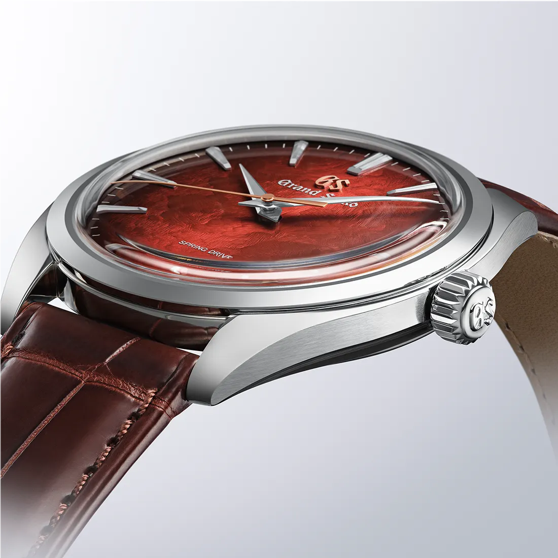 グランドセイコーらしいめりはりと曲面美を併せ持つケース、夜から朝へと向かう、時の流れとともに変わりゆく情景を表現したダイヤル、そして赤みがかった茶色のクロコダイルストラップを組み合わせることで、荘厳な穂高連峰の秋のひとときを映し出しています。
