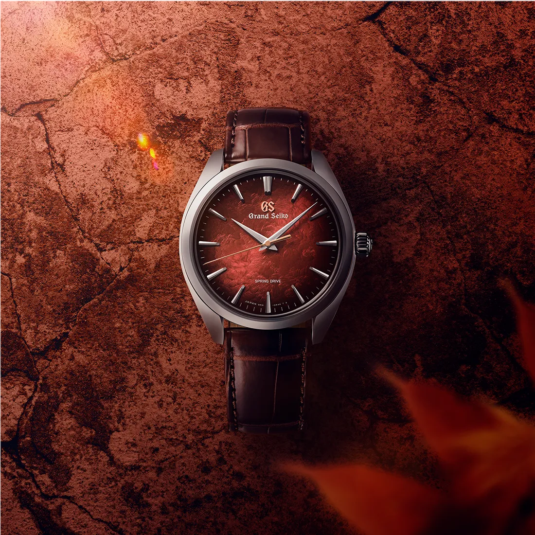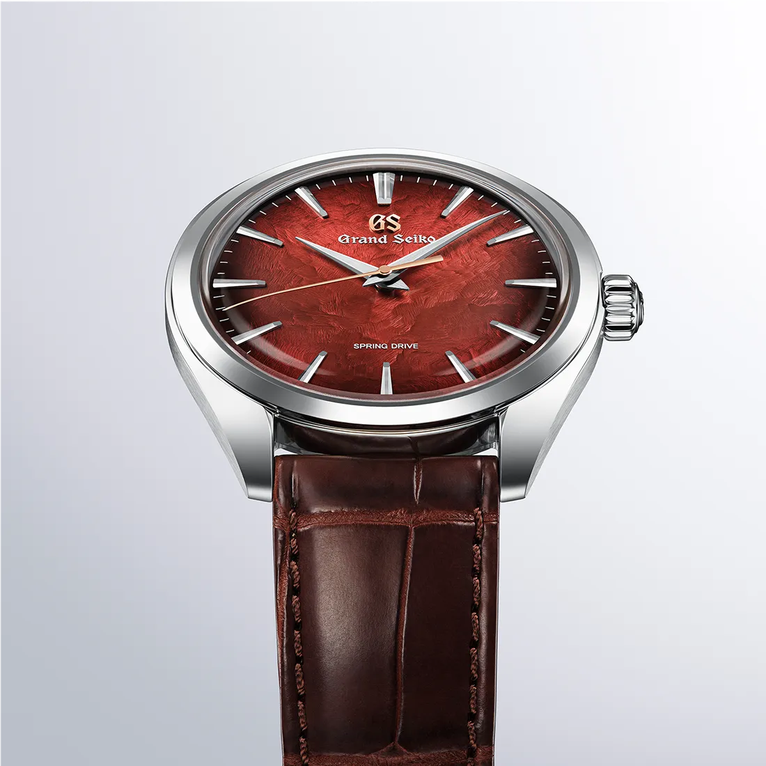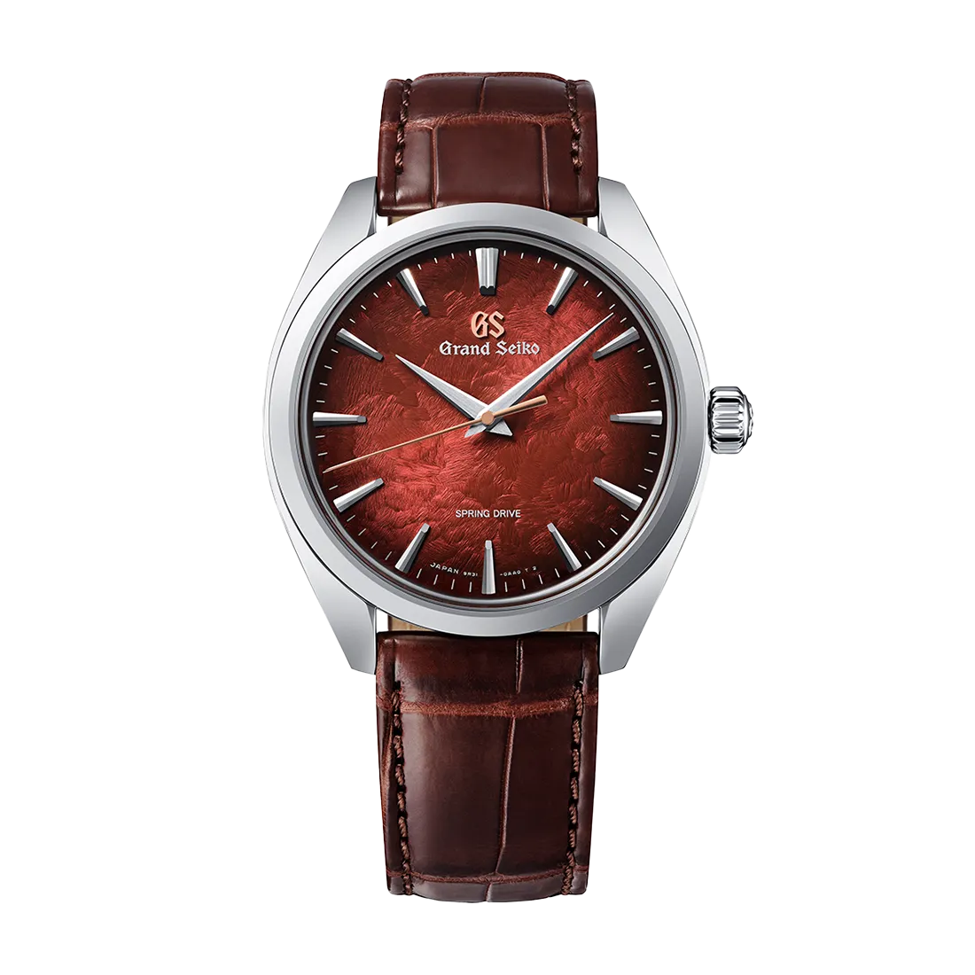 グランドセイコーらしいめりはりと曲面美を併せ持つケース、夜から朝へと向かう、時の流れとともに変わりゆく情景を表現したダイヤル、そして赤みがかった茶色のクロコダイルストラップを組み合わせることで、荘厳な穂高連峰の秋のひとときを映し出しています。