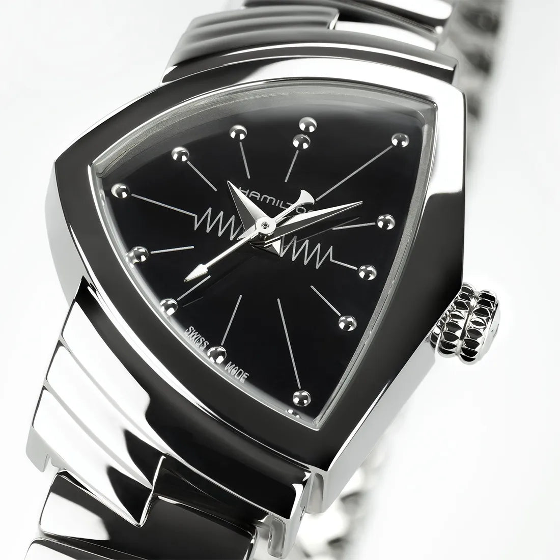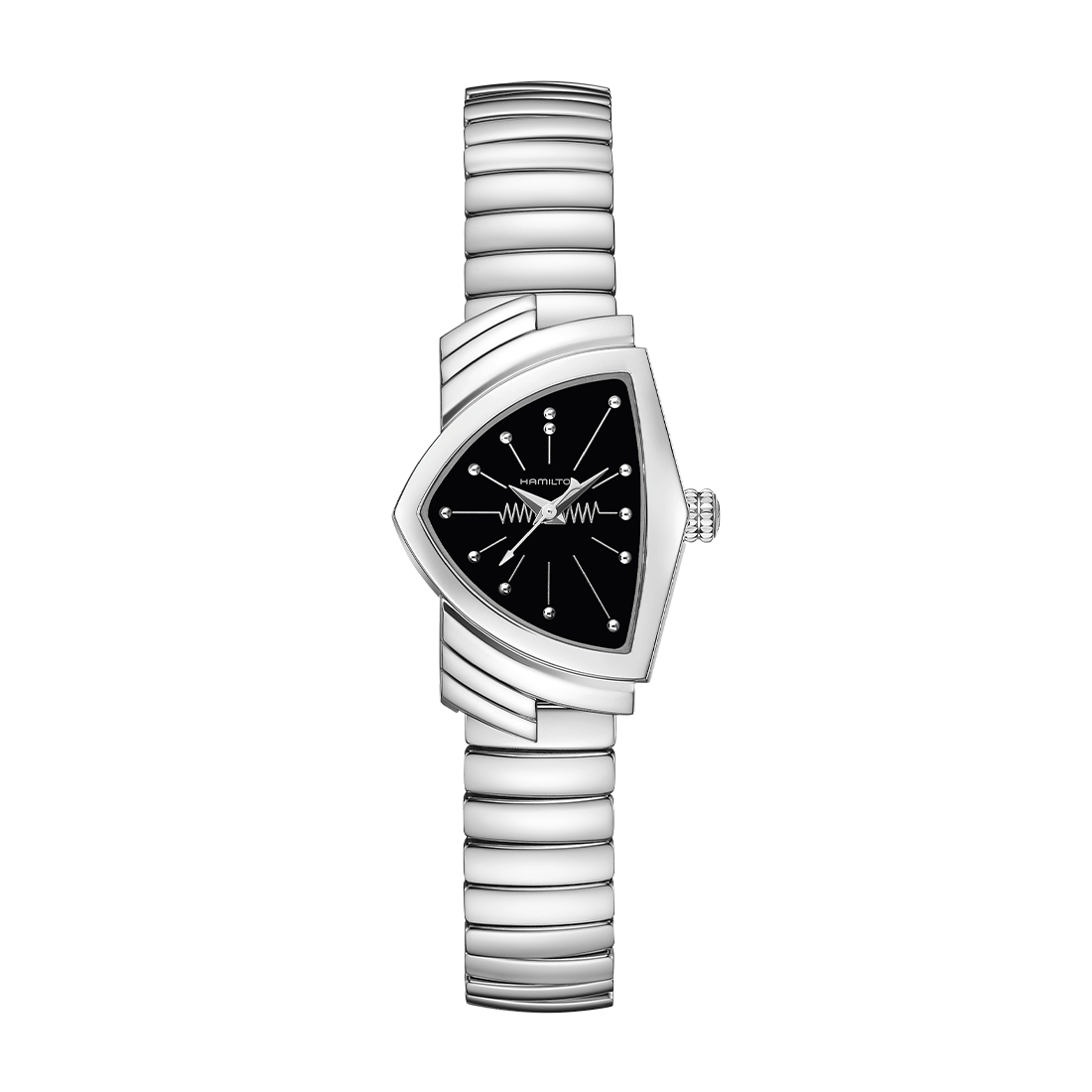 "キング・オブ・ロックンロール"の名をとどろかせた、エルヴィスのトレードマークである、しなやかでフレキシブルなダンス。ロックの自由なスピリットを体現した彼は、「ベンチュラ」にもフレックススタイルのブレスレットをカスタマイズして、愛用しました。「ベンチュラ S クォーツ」は、エルヴィスへのオマージュを込めたフレキシブルなブレスレットを採用し、ミッドセンチュリーモダンにロックのスピリットが息づくデザインに仕上げられています。