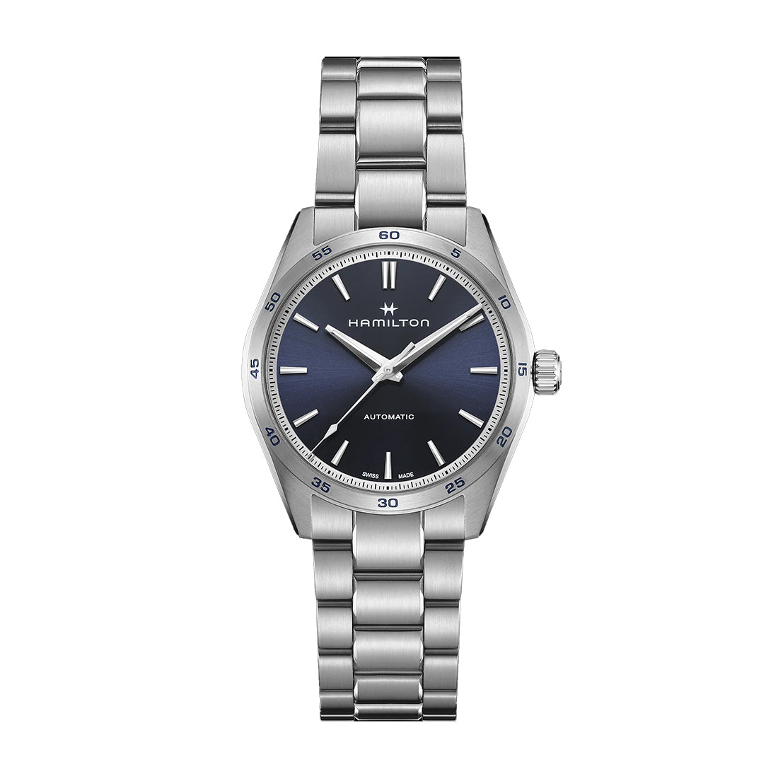 機能性とスタイルの両方を求める方にぴったりな「ジャズマスター パフォーマー」は、パワフルでスポーツシックな外観が特徴です。標準持続時間80時間のH-10自動巻きムーブメントが駆動する「ジャズマスター パフォーマー オート」は、38mmのステンレススチール製ケースに、シンプルなダークブルーのダイヤルと、存在感のあるステンレススチール製ブレスレットが組み合わされています。