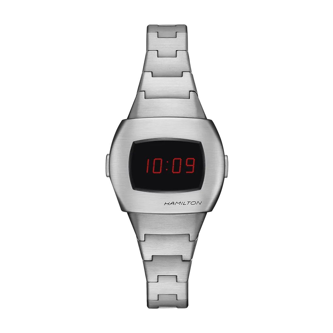 クールさはそのままに、現代に合わせてアレンジした「PSR」。世界を一変させた初のデジタルウォッチと変わらず、紛れもないスタイルで戻ってきました。1974年に初めて登場したクッション型「ハミルトン パルサー」モデルのビンテージシェイプからインスピレーションを得て、宇宙まで行くことができる現代を象徴するモデルであり続けています。新たなクォーツモジュールを搭載した「PSR 74」には、同じハイブリッドディスプレイテクノロジーが採用され、反射型LCD(液晶ディスプレイ)と発光するOLED(有機発光ダイオード)が組み合わされています。セコンドボタンが新たに追加され、レッドの数字表示と共に日付表示機能でさらに便利になりました。