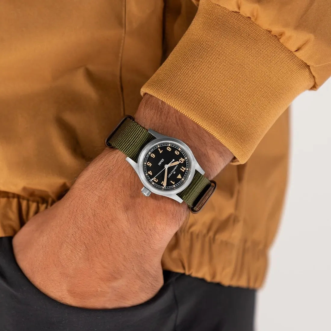 カラーパレットは控えめで、オールドラジウムカラーのスーパールミノバ®加工を施したインデックスによって、洗練されたブラックダイヤルが強調されています。グリーンテキスタイルを使用したNATOストラップとブラウンのレザーループが付属し、次のアウトドアでの冒険にぴったりです。