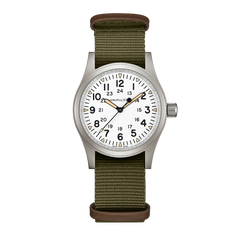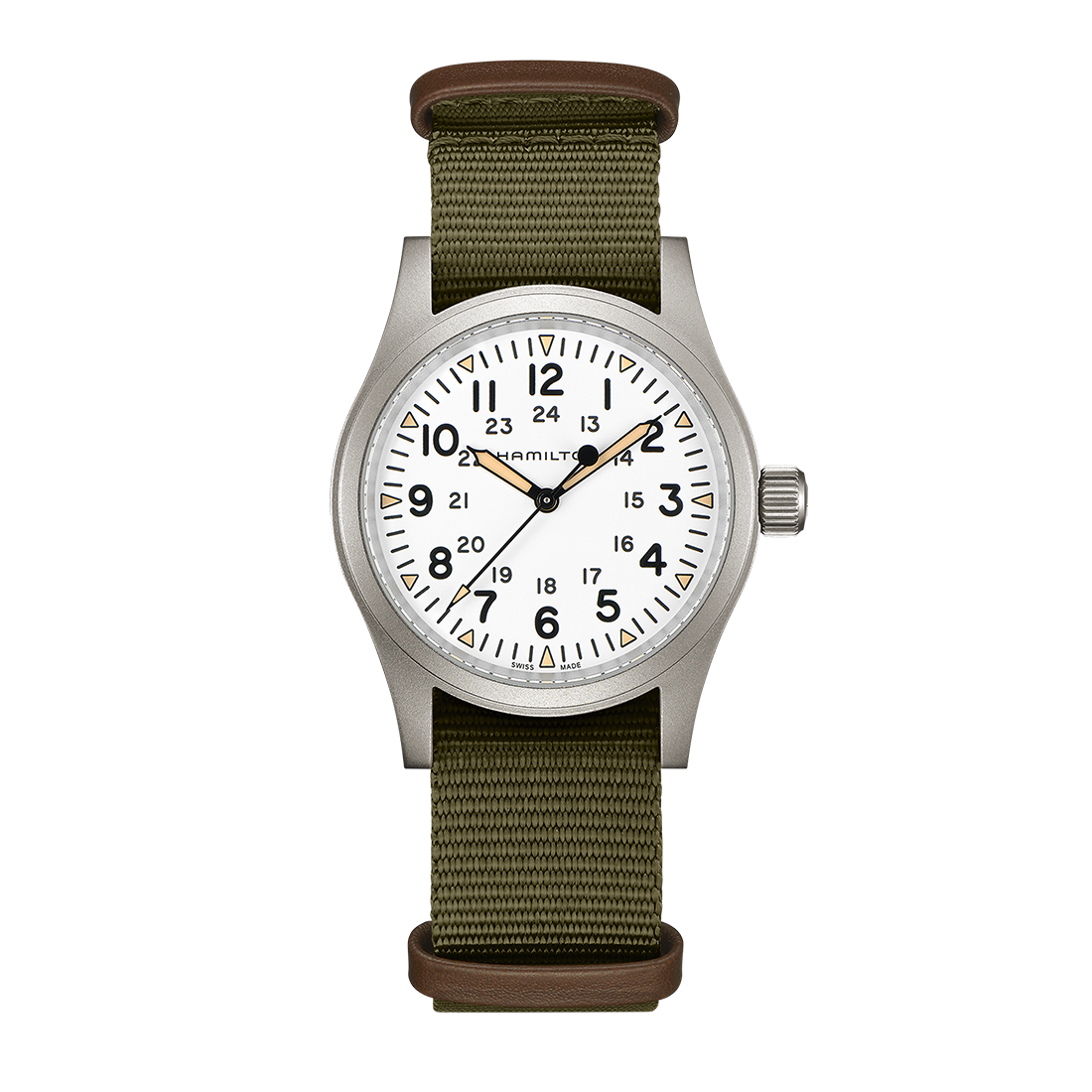 38㎜のつや消しのステンレススチール製ケース、3針表示、ホワイトのダイヤル、オールドラジウムカラーのスーパールミノバ®を塗布した三角形のインデックス、耐久性に優れたNATOストラップ。新しい「カーキ フィールド メカ」は、1960年代のオリジナルモデルに忠実なモデルであり、ハミルトンのミリタリーウォッチのDNAを色濃く反映しています。本物のミリタリースピリットを宿すラギッドで堅牢なタイムピースです。