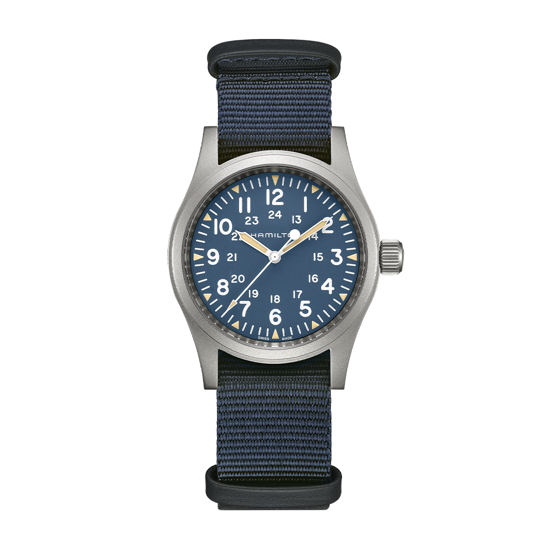 小小さいながらも頑強。「カーキ フィールド メカ」は、屋外活動における頼れる相棒です。 38mmのステンレススチール製ケースに収められ、印象的なホワイトインデックスを備えたクールなブルーダイヤルにはスーパールミノバ®加工が施され、視認性を高めます。 タフなNATOストラップを採用した「カーキ フィールド メカ」は、1960年代のオリジナルモデルに忠実な復刻版で、ハミルトンのミリタリーウォッチとしての歴史を継承しています。