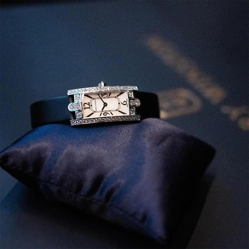 47個のラウンド・ブリリアントカット・ダイヤモンド ダイヤル:ホワイト マザー・オブ・パール ストラップ:ブラック サテン バックル:18Kホワイトゴールド 総カラット数: 47個のラウンド・ブリリアントカット・ダイヤモンド(約0.69カラット) |