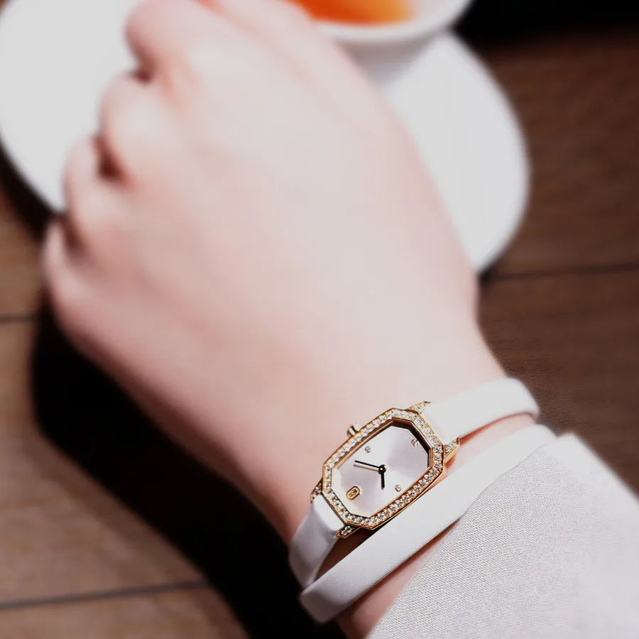 53個のラウンド・ブリリアントカット・ダイヤモンド ダイヤル:ホワイト サンレイ・サテン仕上げ 3個のラウンド・ブリリアントカット・ダイヤモンド ストラップ:ホワイト サテン 11個のラウンド・ブリリアントカット・ダイヤモンド バックル:18Kローズゴールド 総カラット数: 67個のラウンド・ブリリアントカット・ダイヤモンド(約0.52カラット) |