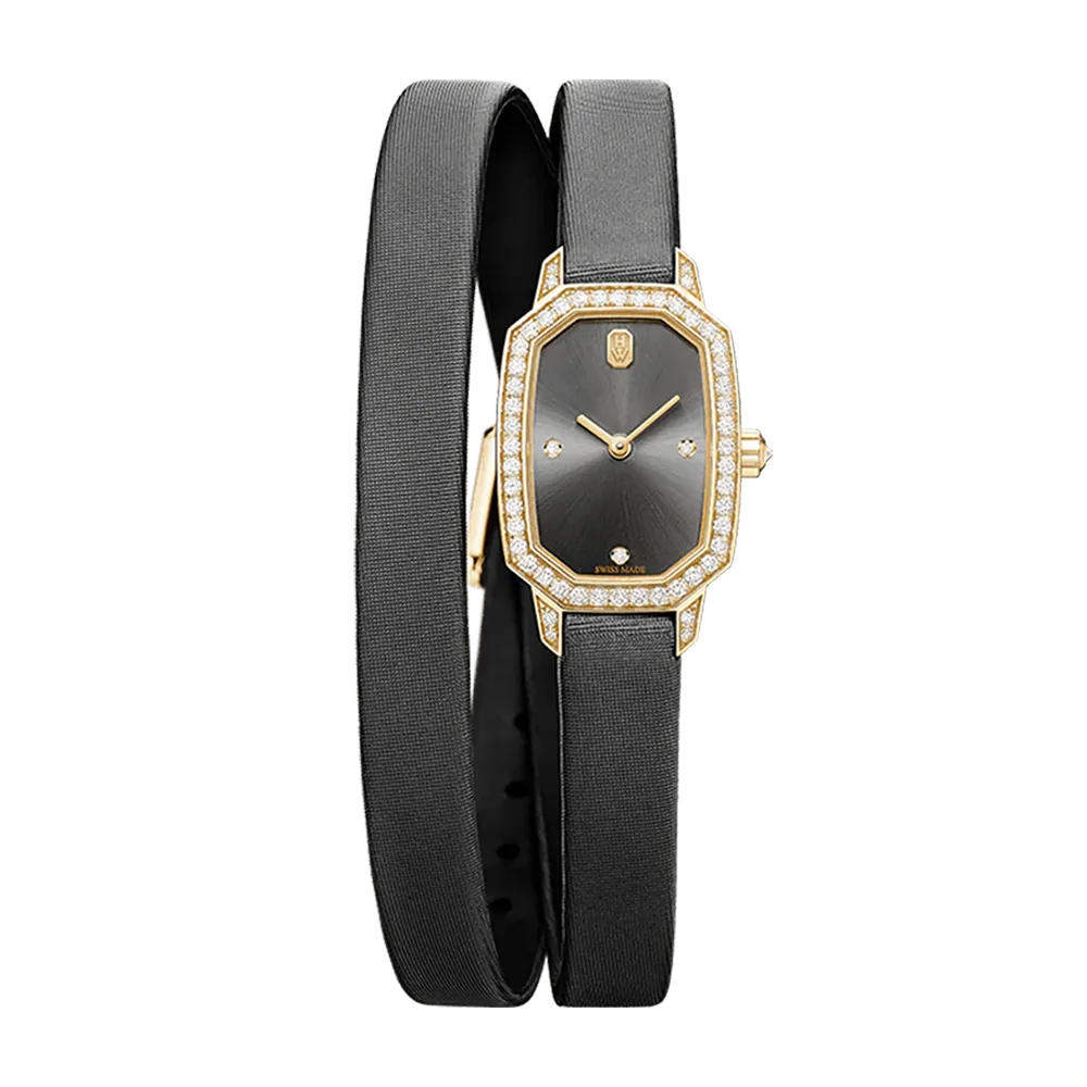 53個のラウンド・ブリリアントカット・ダイヤモンド ダイヤル:アンスラサイトグレーサンレイ・サテン仕上げ 3個のラウンド・ブリリアントカット・ダイヤモンド ストラップ:アンスラサイトグレー サテン 11個のラウンド・ブリリアントカット・ダイヤモンド バックル:18Kイエローゴールド 総カラット数: 67個のラウンド・ブリリアントカット・ダイヤモンド(約0.52カラット) |