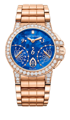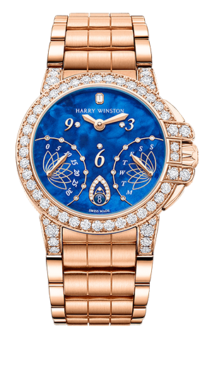 レトログラードとオフセンター配置の時・分表示というHW オーシャン・コレクションを象徴する2つの要素が圧倒的な存在感を放つ一方で、マザー・オブ・パールの美しい色彩とダイヤモンドの輝きがその魅力をさらに引き立てます。