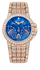 レトログラードとオフセンター配置の時・分表示というHW オーシャン・コレクションを象徴する2つの要素が圧倒的な存在感を放つ一方で、マザー・オブ・パールの美しい色彩とダイヤモンドの輝きがその魅力をさらに引き立てます。