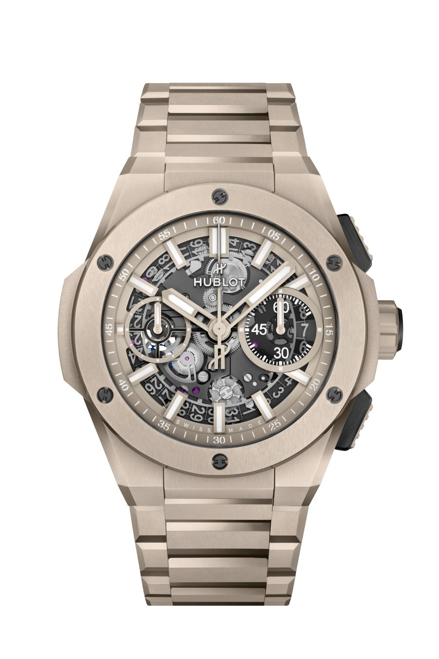 ベゼル:サテン&ポリッシュ仕上げのベージュセラミック、6本のチタニウム製H型ビス ストラップ:サテン&ポリッシュ仕上げのベージュセラミック ブレスレット クラスプ:チタニウム(ブラックコーティング) |