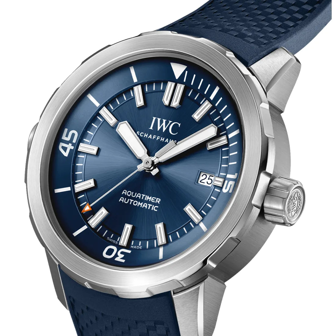 この「アクアタイマー・オートマティック」はIWC自社製キャリバー32111を搭載し、ステンレススティール製ケース、ブルーの文字盤、ブルーのラバー・ストラップを備えています。