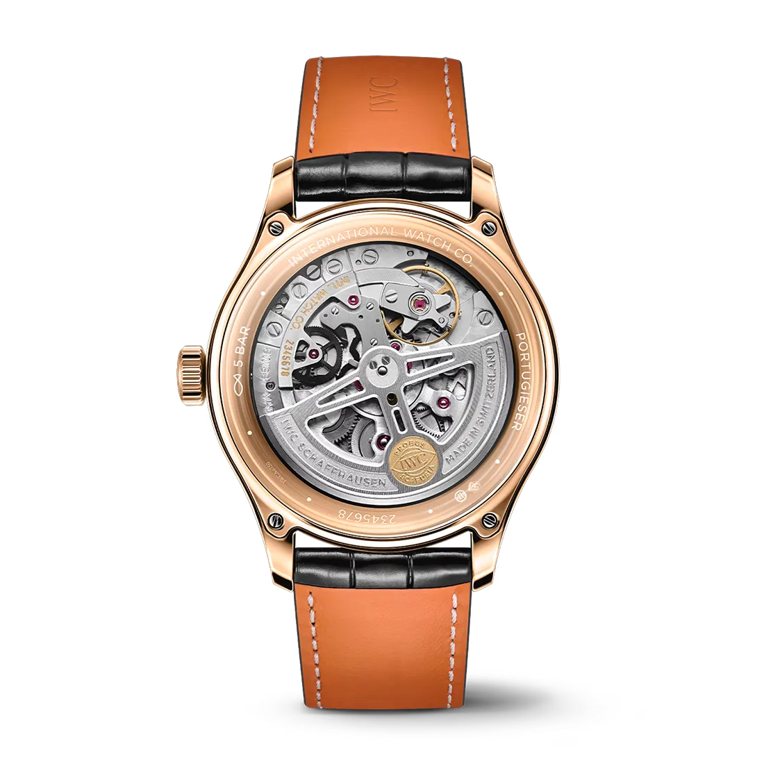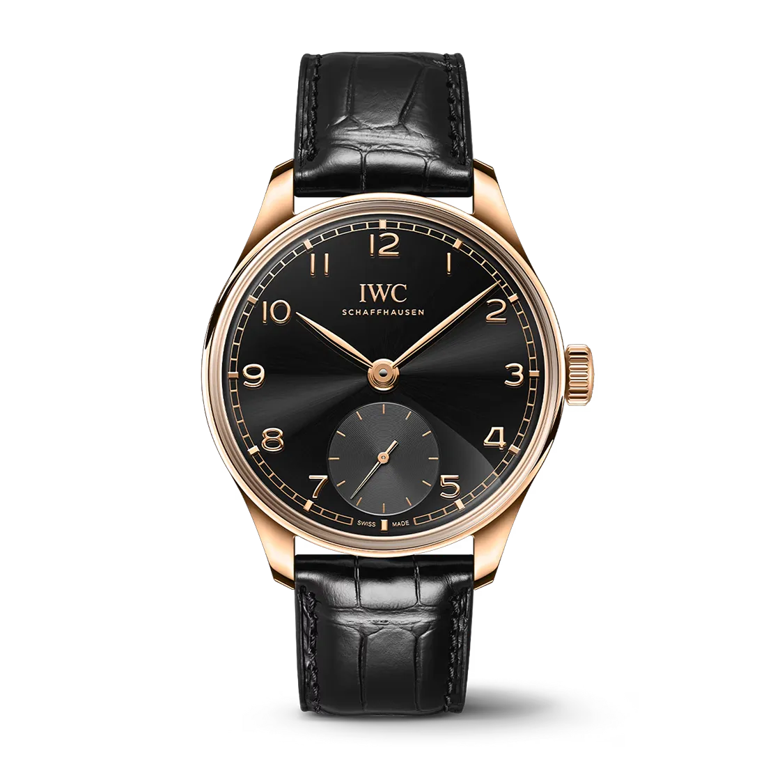18Kレッドゴールド製ケースの「ポルトギーゼ・オートマティック 40」。黒曜石の文字盤、ゴールドメッキの針、ゴールドのアップライト・インデックス、ブラックのサントーニ社製アリゲーター・ストラップを備えています。