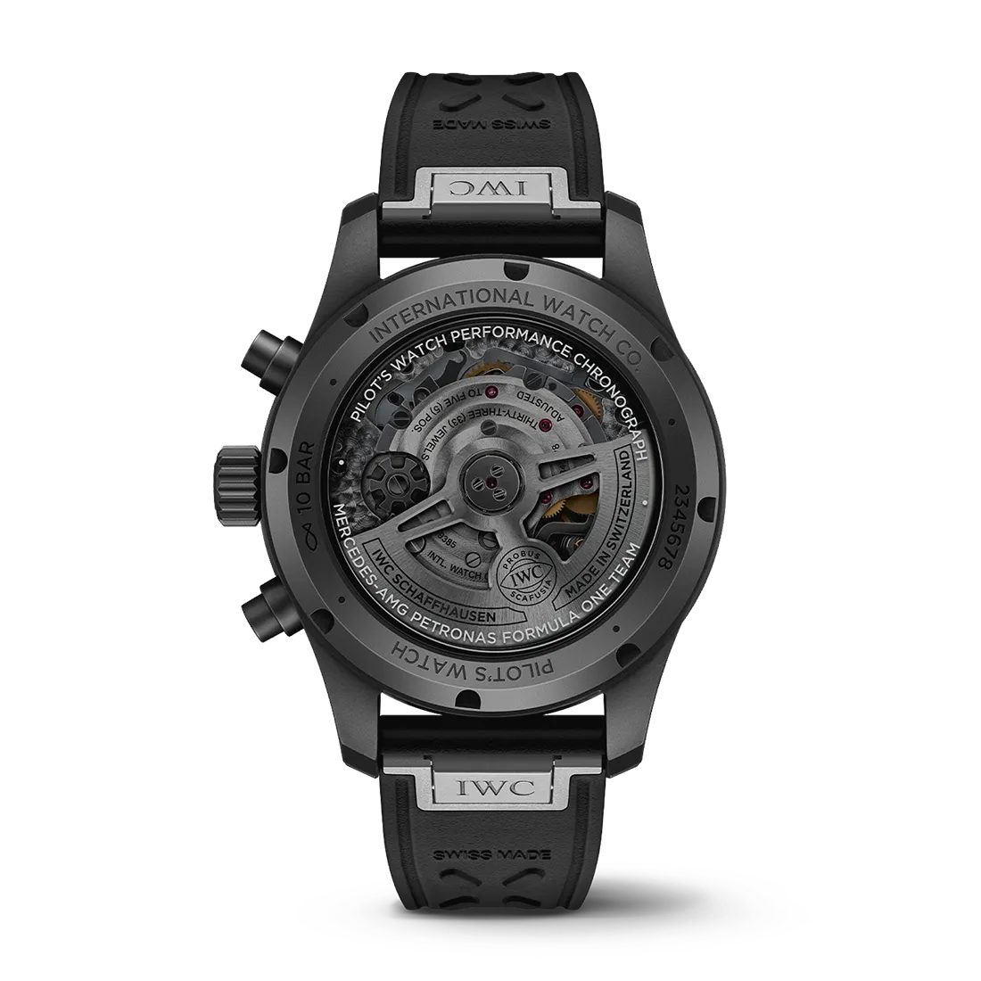 「パイロット・ウォッチ・パフォーマンス・クロノグラフ 41」は、メルセデスAMGペトロナス・フォーミュラワン™・チームにオマージュを捧げるモデルです。IWCは2013年より、同チームの公式エンジニアリングパートナーを務めています。直径41mmのケースとケースバックのリングに使用されているのは、セラタニウム®です。IWCが開発した軽量素材セラタニウム®は、特殊なチタン合金をベースとし、チタンの軽さと堅牢な構造、そしてセラミックに匹敵する硬さと耐傷性能を兼ね備えています。このウォッチの卓越した機能のひとつが、タキメーター・スケールを備えるセラミック製ベゼルです。これにより、移動距離に対する平均速度を算出することが可能です。ポリッシュ仕上げが施されたブラックセラミック製ベゼルとマッチするよう、ブラックの文字盤には光沢のある仕上げが施されています。ブラックニッケル製のイン・ダイヤル積算計、針、アップライト・インデックスと数字はスーパールミノヴァ®が塗布され、文字盤に深みを与えると同時に、夜間の優れた視認性を確保しています。搭載ムーブメントは、「パイロット・ウォッチ・オートマティック 41 “ブラック・エイセス”」。242個もの部品で構成されるこの機械式クロノグラフムーブメントは、着色されたサファイアガラス製の裏蓋から鑑賞することができます。また、双方向爪巻上げ機構によって主ゼンマイに46時間のパワーリザーブを蓄えます。コラムホイール式のクロノグラフには、表示切り替えの各工程が確実に行われるよう制御する仕組みが採用されており、ボタンを押すとしっかりとした手ごたえが感じられます。サブダイヤルはIWCらしい垂直のレイアウトで配置され、計測された分を12時位置に表示する視認性の高いデザインに仕上げられています。10気圧防水を備え、セラタニウム®製ピンバックルを備えた耐久性と防水性に優れるブラックのラバー・ストラップが合わせられています。