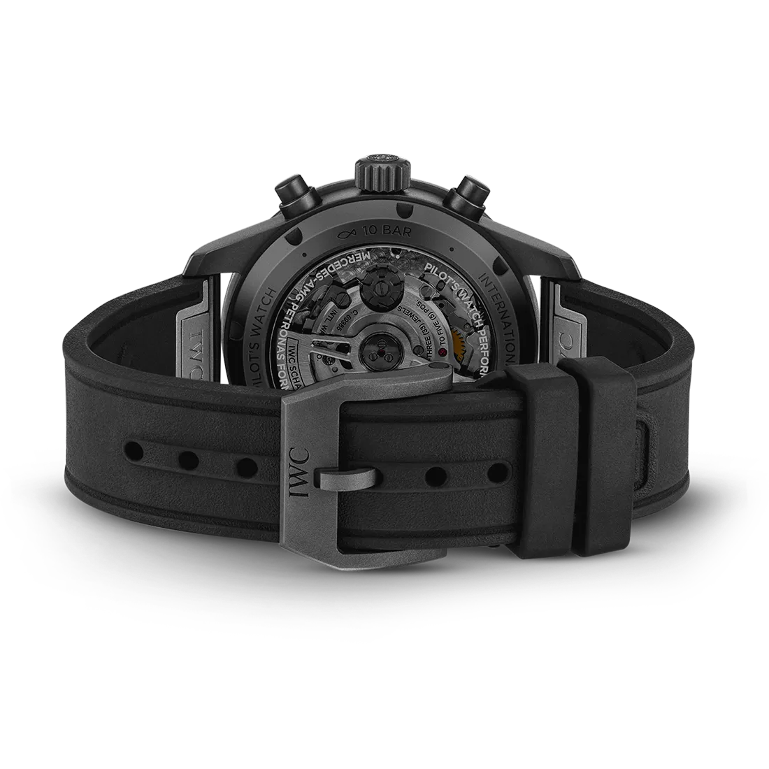 「パイロット・ウォッチ・パフォーマンス・クロノグラフ 41 “Mercedes-AMG PETRONAS Formula One™ Team”」は、直径41mmのセラタニウム®製ケース、ブラックの文字盤、ブラックニッケル製の針とアップライト・インデックス、ブラックのラバー・ストラップを備えています。
