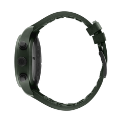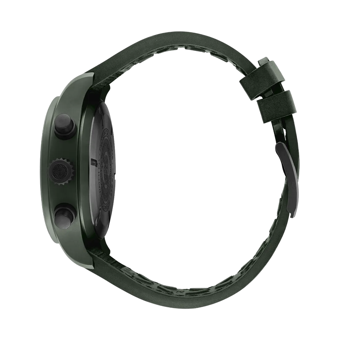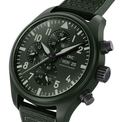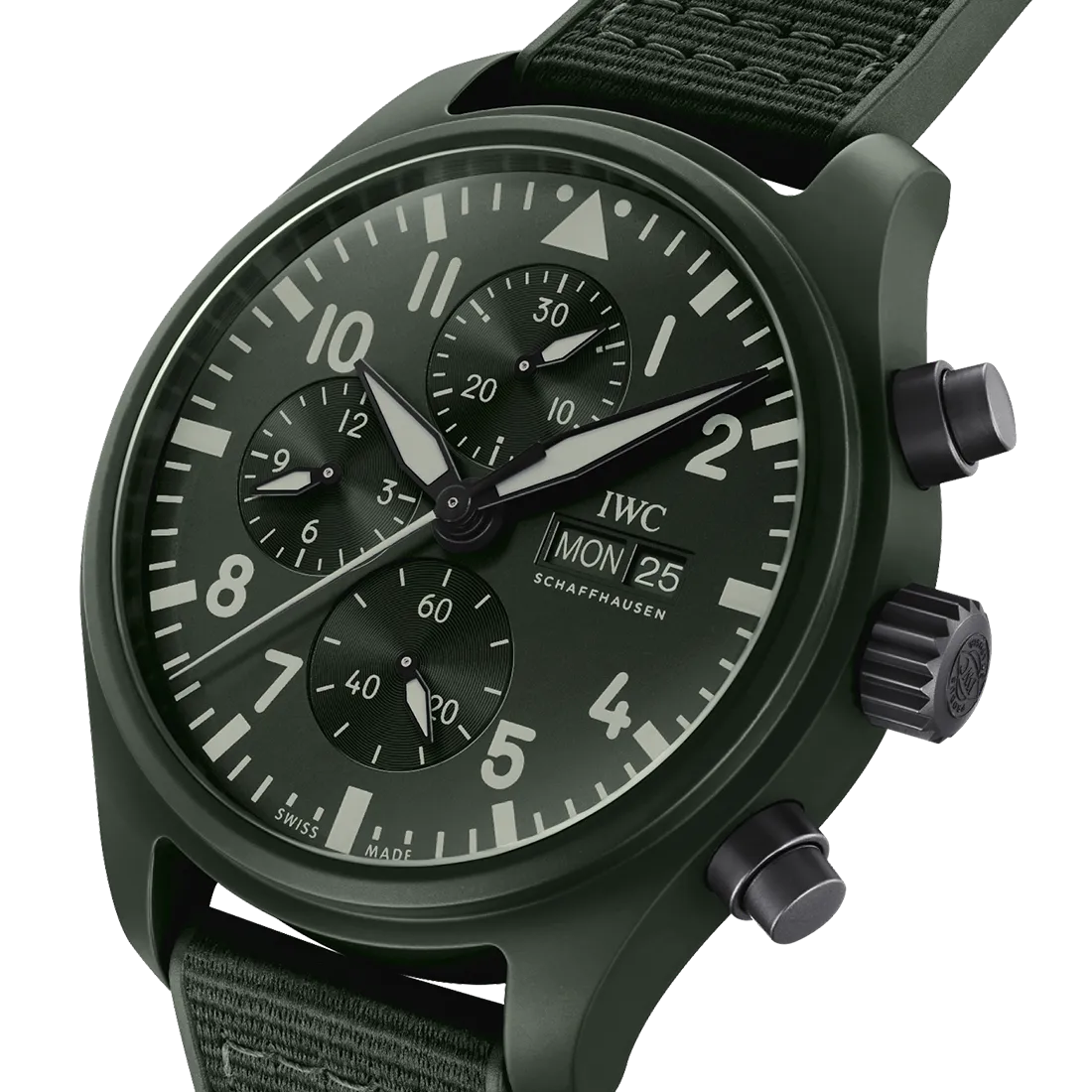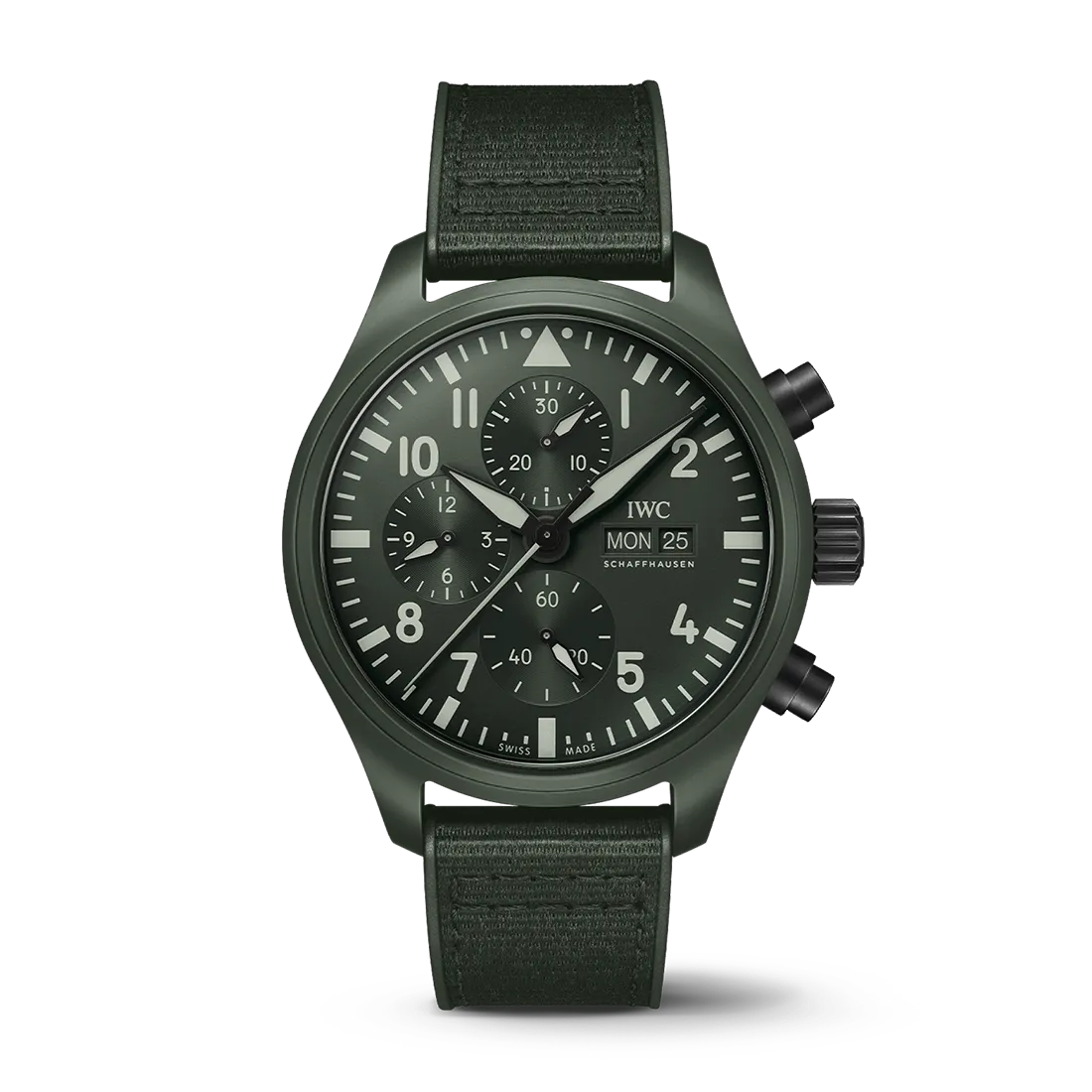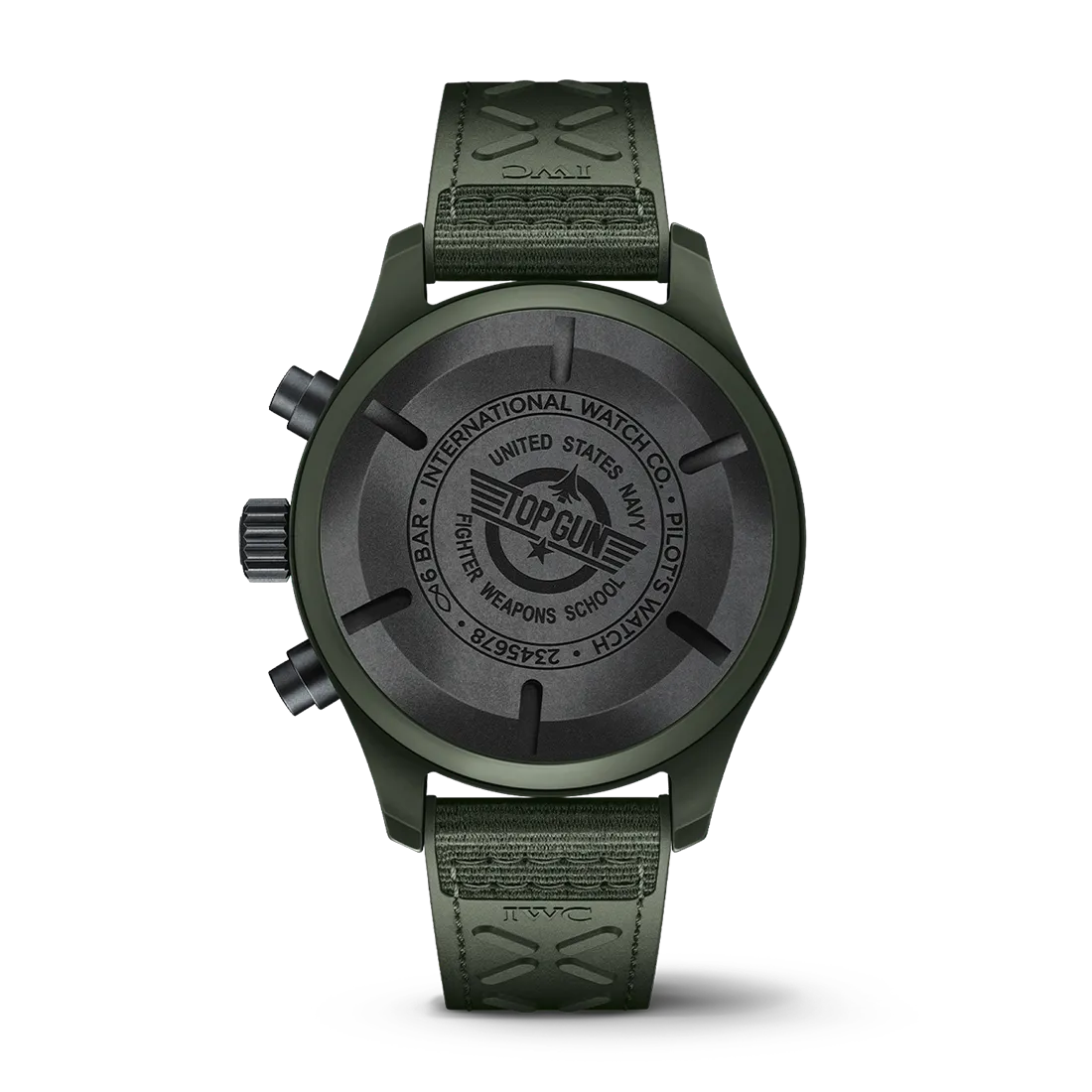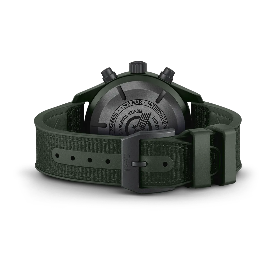 トップガンパイロットのフライトスーツや制服、また彼らがトレーニングを行う空域のある広大な森の風景からインスピレーションを得て生まれたダークグリーンカラーの“ウッドランド”が、IWCのカラーセラミックのラインナップに加わりました。「パイロット・ウォッチ・クロノグラフ・トップガン “ウッドランド”」はこのカラーコードを使用した初のモデルです。カラーセラミックは、酸化ジルコニウムに他の金属酸化物を混合する高度な製造工程を経て作られます。焼成中に色が変化するため、原材料の配合を決定するには数えきれないテストと膨大な知識を必要としました。モノクロームのデザインは、ダークグリーンの文字盤とブラックの針、落ち着きのあるホワイトのプリントと夜光塗料によって引き立てられています。プッシュボタン、リューズ、トップガンのロゴがエングレーヴィングされたケースバックはセラタニウム®製です。IWCが開発したこのマットブラックの素材は、チタニウムに匹敵する軽さと堅牢性を持ちながら、セラミック同様の硬度と耐傷性を備えています。そして、直径44mmのセラミック製ケース内部で駆動力を生み出すのが、IWC自社製キャリバー69380です。伝統的なコラムホイール・デザインを採用したこのクロノグラフムーブメントは、3時位置に日付・曜日表示も備えています。ムーブメントは、軟鉄製インナーケースによって磁場の影響から保護されています。この「トップガン」クロノグラフには、“ウッドランド”ケースと美しく調和する布製インレイが付いたグリーンのラバー・ストラップが付属します。
