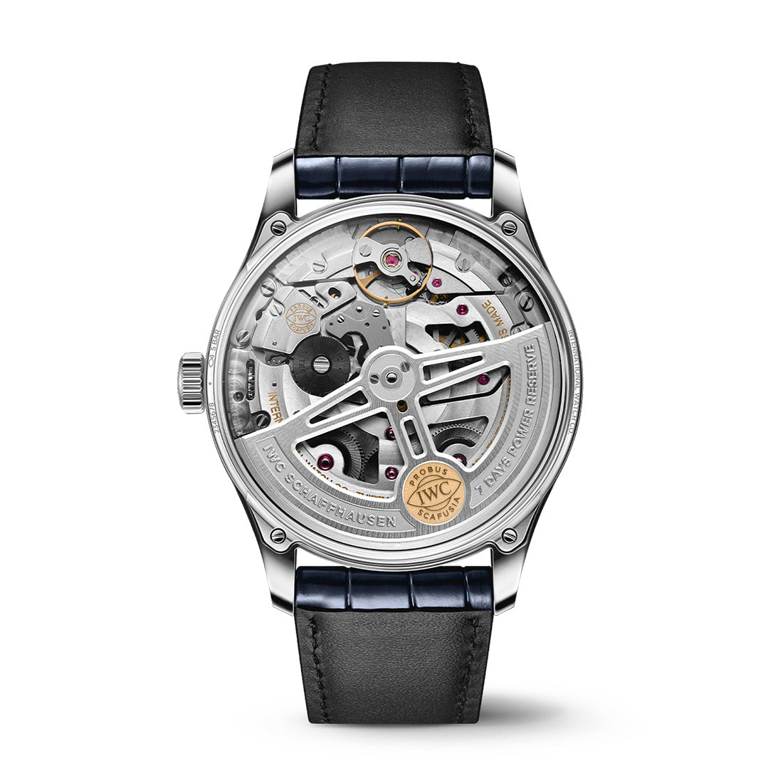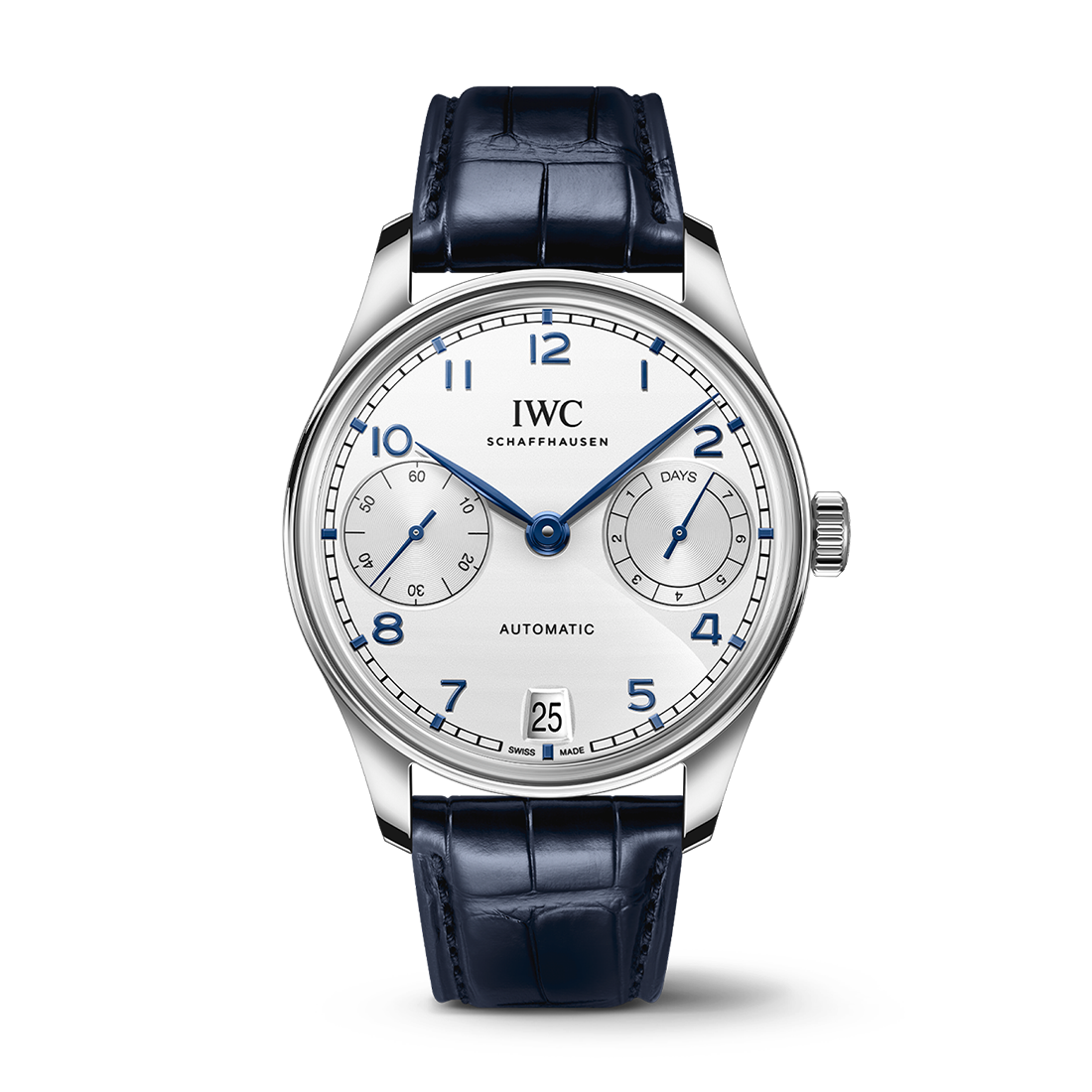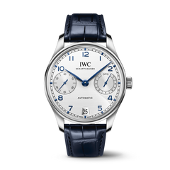 「ポルトギーゼ・オートマティック 42」は、ステンレススティール製ケース、シルバーメッキの文字盤、ブルーの針とインデックス、ブルーのアリゲーター・ストラップを特徴とするIWCシャフハウゼンの腕時計です。1930年代末の「ポルトギーゼ」の起源を持ち、2000年に初登場しました。文字盤には3時位置にパワーリザーブ表示、9時位置にスモールセコンドがあります。ケースは直径42.4mmで、ボックス型サファイアガラスが使用されています。文字盤は60工程を経て作られ、15層のラッカーを塗り重ねた奥行きのある美しさが特徴です。ムーブメントはIWC製キャリバー52011で、ぺラトン自動巻き機構と7日間のパワーリザーブを持ちます。ブルーのアリゲーターストラップとステンレススティール製フォールディングクラスプが付属しています。
