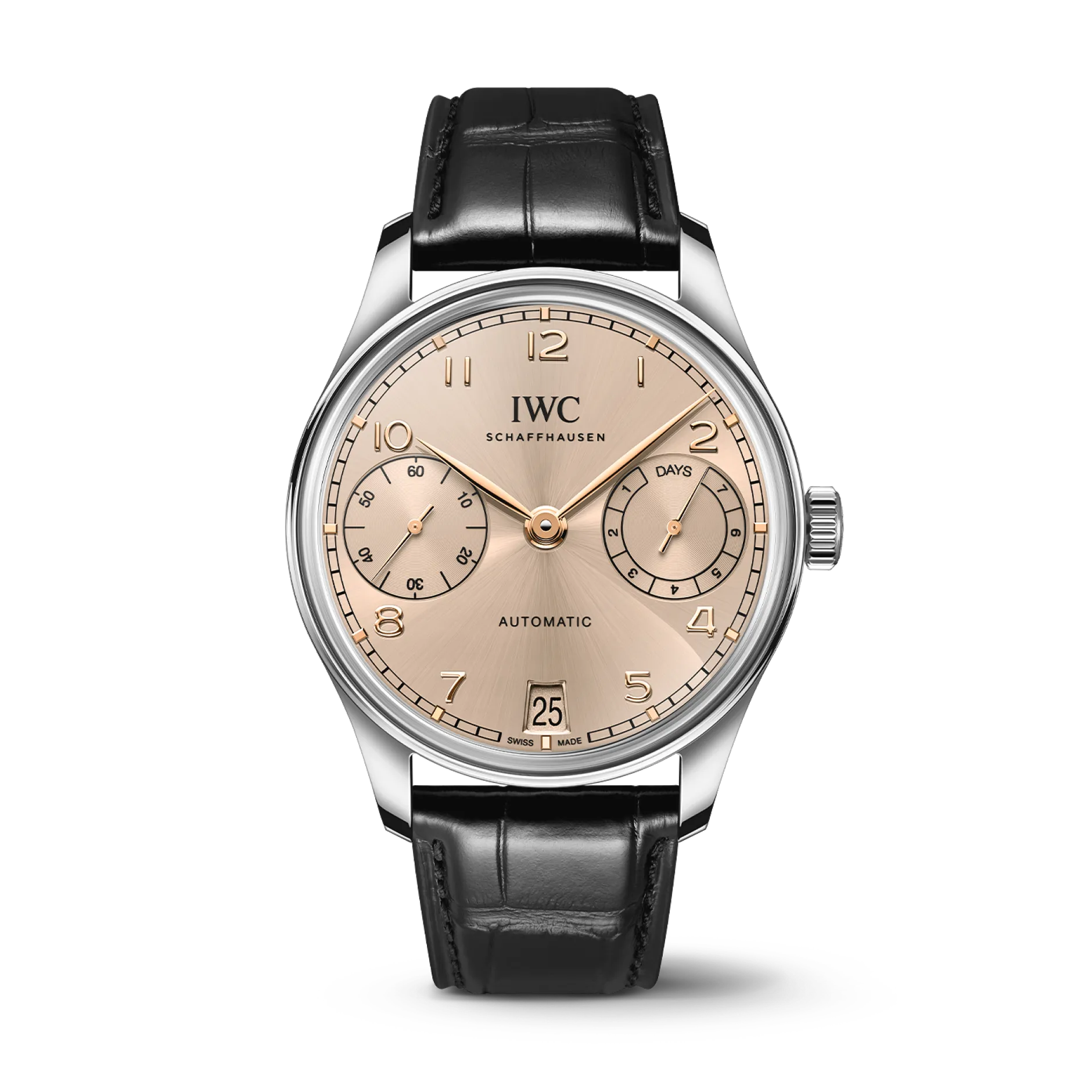 ステンレススティール製ケースの「ポルトギーゼ・オートマティック 42」。デューンの文字盤、ゴールドメッキの針とゴールドのアップライト・インデックス、ブラックのアリゲーター・ストラップを備えています。