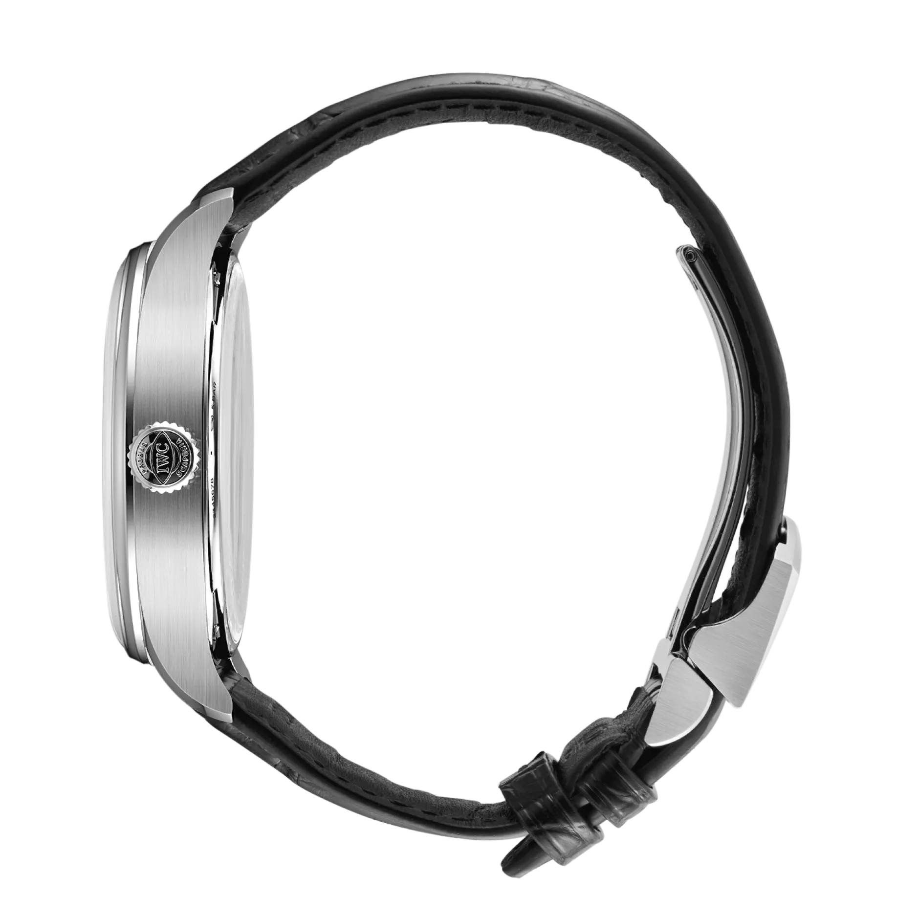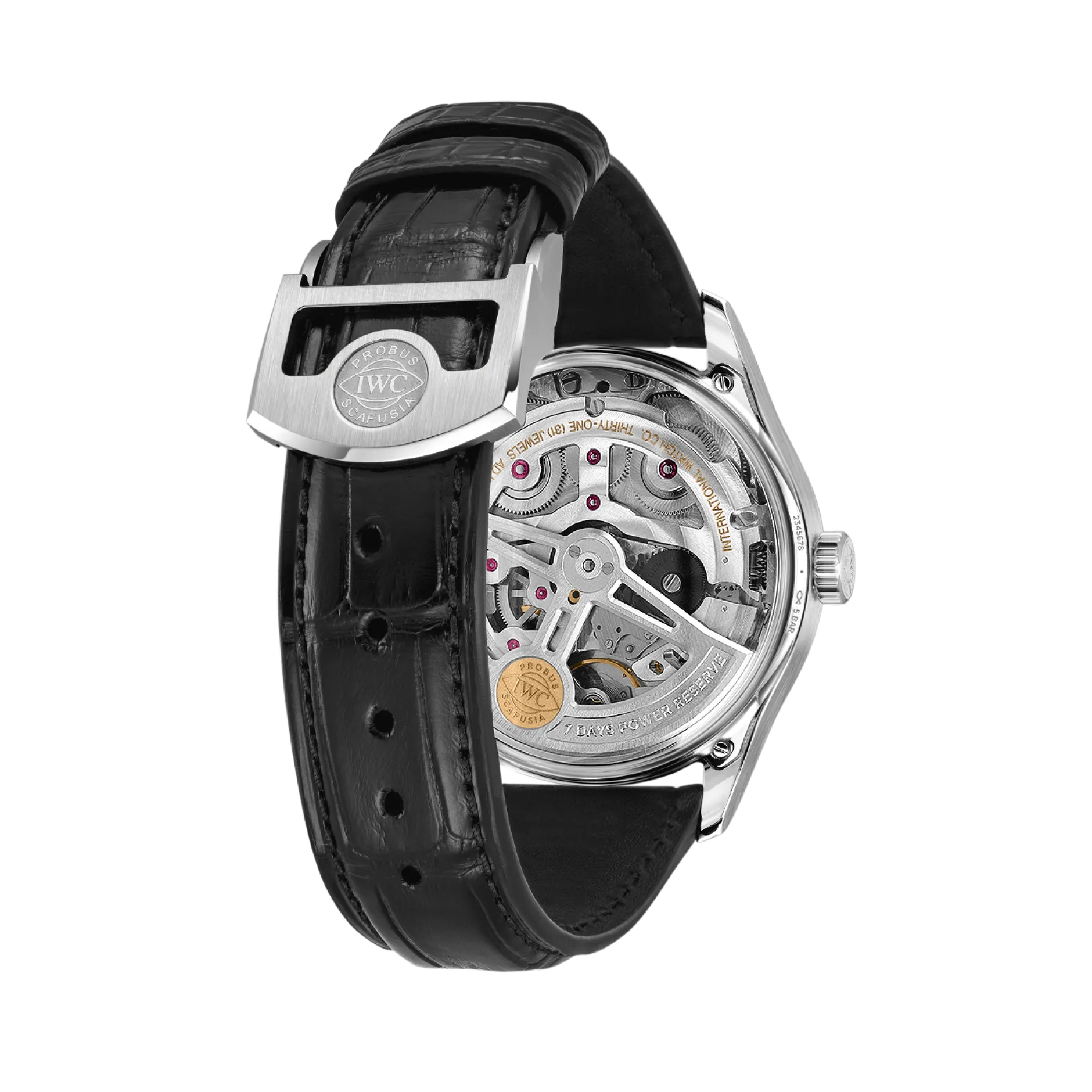 「ポルトギーゼ」の起源は1930年代末に遡り、高精度ポケットウォッチのムーブメントを使って、大型腕時計が制作されました。2000年に登場した「ポルトギーゼ・オートマティック 42」は、バランスの良い文字盤デザインを持ち、3時位置にパワーリザーブ表示、9時位置にスモールセコンドを備えています。ステンレススティール製ケースと、丁寧に仕上げられた精巧な文字盤が特徴で、15層のラッカーで美しい光沢が生まれます。IWC自社製キャリバー52011ムーブメントを搭載し、7日間のパワーリザーブが可能です。ブラックのアリゲーターストラップとステンレススティール製フォールディング・クラスプが付属しています。