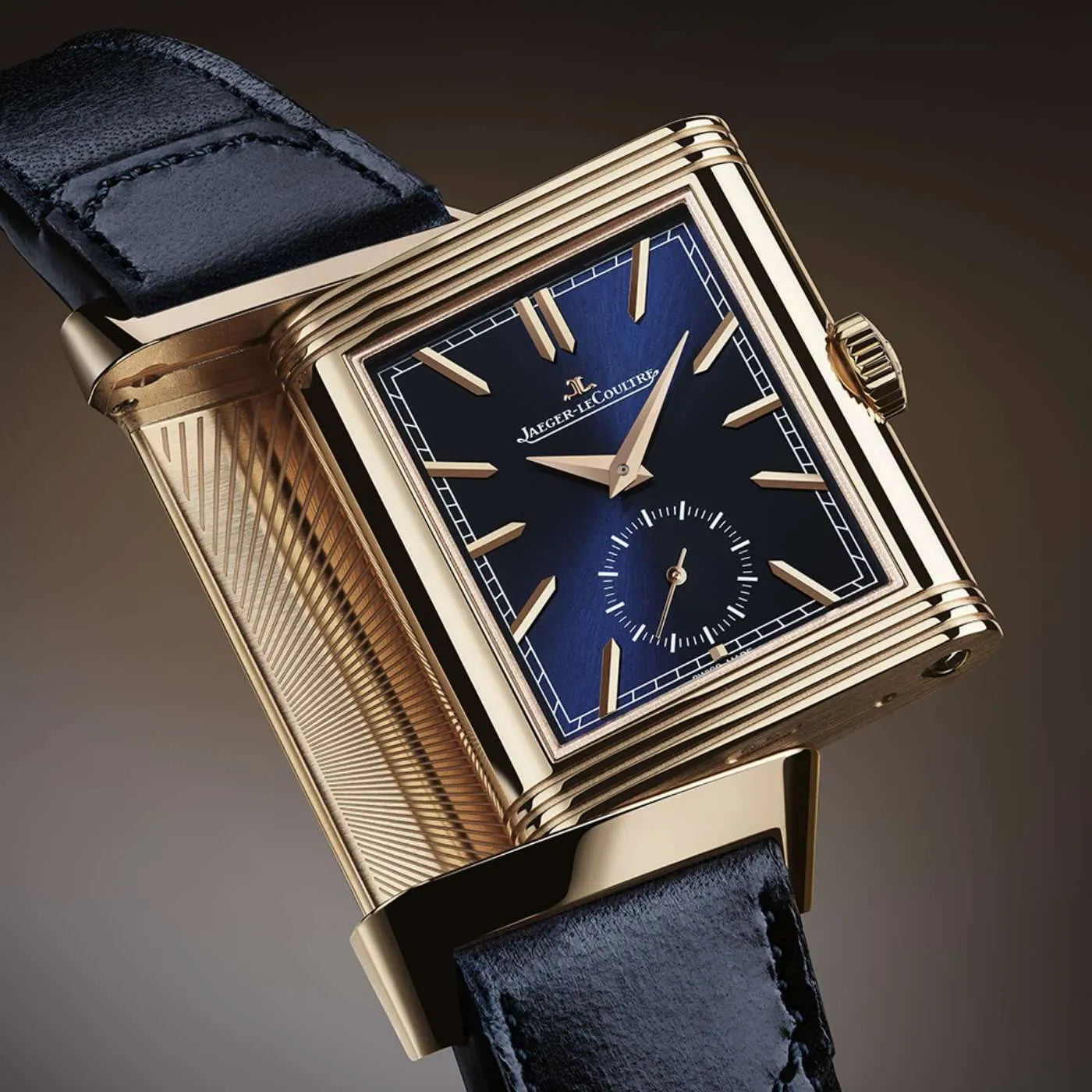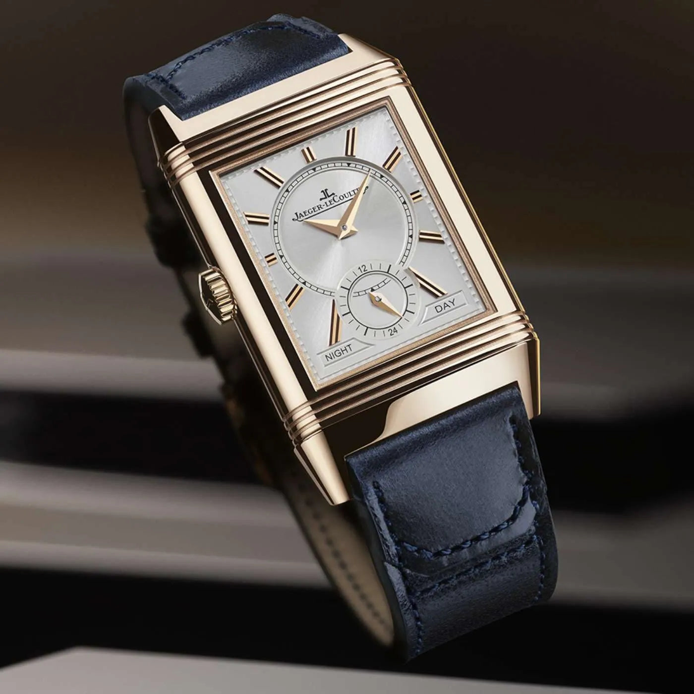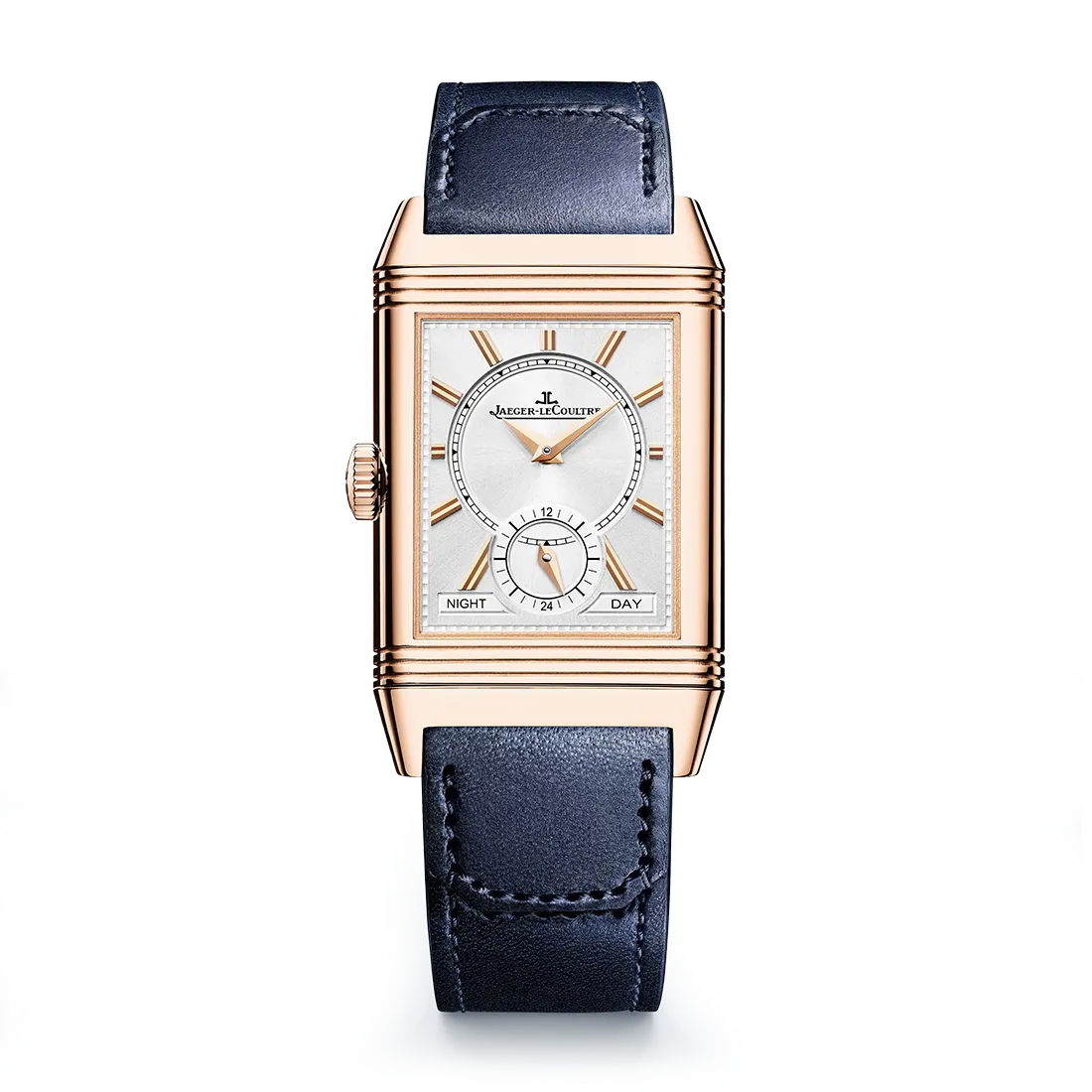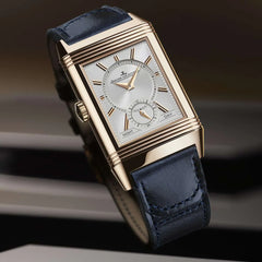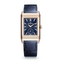 洗練さ溢れるピンクゴールドのケースを纏ったレベルソ・トリビュート・デュオ・スモールセコンドには、シュマン・ド・フェール、植字インデックス、ドーフィン針などがあしらわれ、1931年発表の初代レベルソを象徴するデザインコードが息吹いています。50の製造工程により製作されたタイムピースの表面は、20回に及ぶ複雑なラッカー塗装により完成したサンレイ仕上げのディープブルーラッカーダイヤルが美しい質感と奥行きで魅了します。第2時間帯を表示する裏面では、サンレイ仕上げのシルバーダイヤルがマニュファクチュール製キャリバー854を搭載したタイムピースを細部に至るまで際立たせ、上質なエレガンスを醸し出しています。タイムピースには、ダイヤルの色彩と響き合うブルーのカーフストラップと、質感のコントラストが魅力的なデュアル素材のブルーストラップの計2本が備わり、どちらもご自身で容易に交換が可能なインターチェンジャブルシステムを採用しているため、シーンやニーズに合わせて様々なスタイルをお楽しみいただけます。