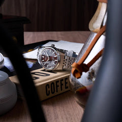 こちらのクラシックなカラーの文字盤はブラウンダイアル。他モデルとは異なった個性を演出できる他、秋~冬の暖色系のコーディネートが活躍するタイミングには特に重宝するカラーなのではないでしょうか。クラシックデザインとの親和性も高く、より大人っぽい、上品な仕上がりとなっています。
