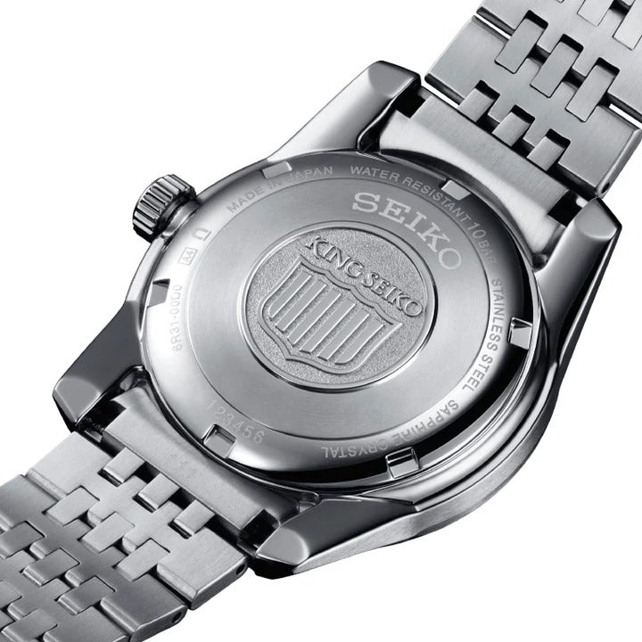 りゅうずと裏ぶたには、時計と共に復活を果たしたキングセイコーの「盾」をモチーフとしたブランドマークが刻まれています。