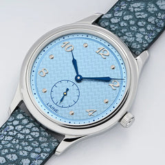 ペールブルーにツイル模様(綾織)で装飾した文字盤。ホワイトゴールド製のアラビア数字やドットと組み合わせています。ライトブルーのオストリッチ製ストラップです。