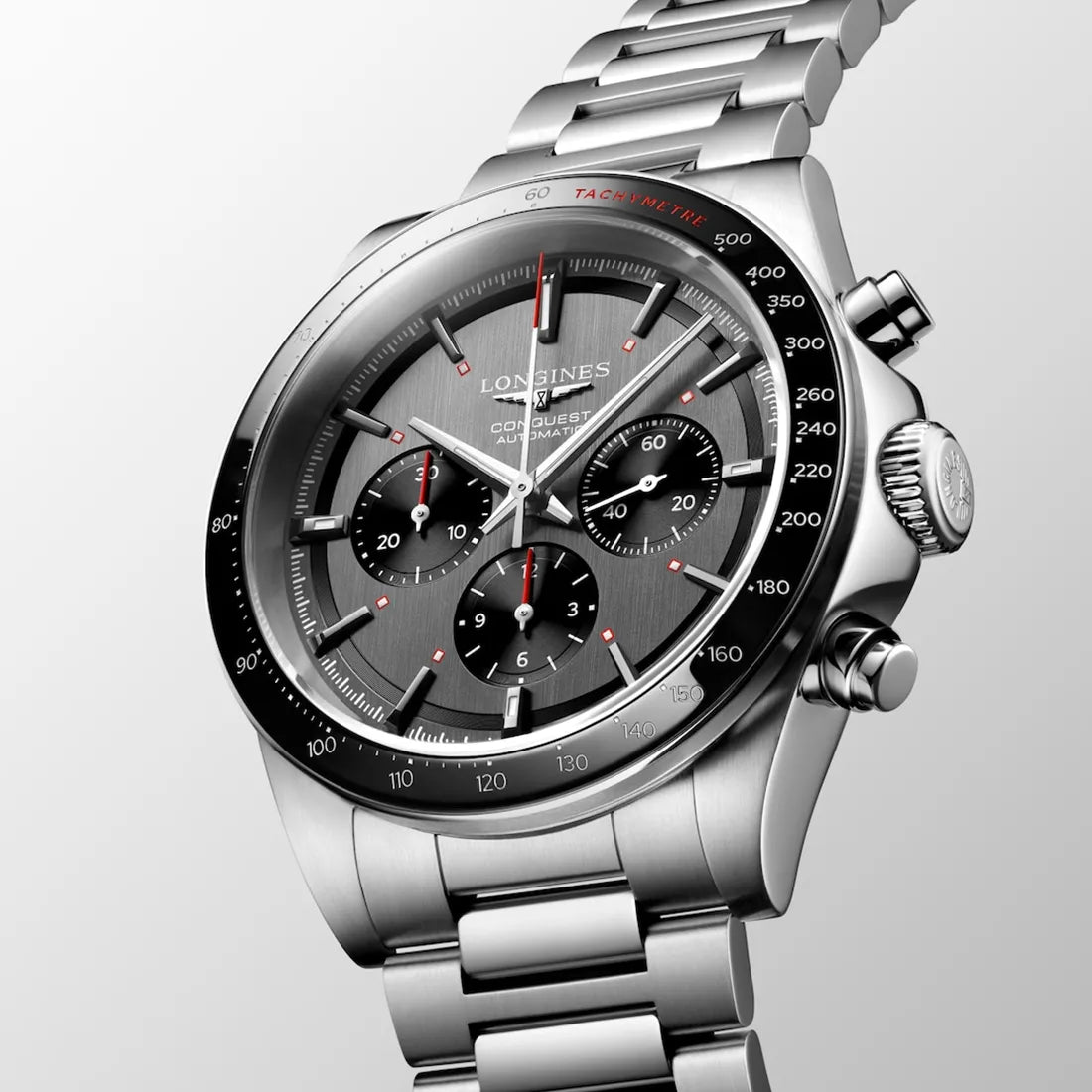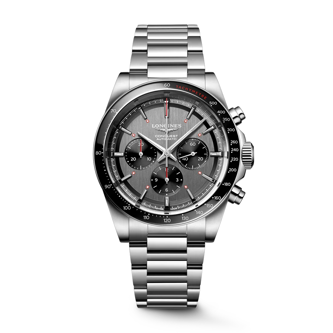毎日に彩りを添える究極のタイムピース「コンクエスト」は、1954年、スイス連邦知的財産局によってその名が保護されたロンジンで初めてのコレクションです。それ以来、コレクションはデザインや技術面での進化を遂げながらも、大胆さや現代的なスタイル、スポーティなエレガンスが調和するシリーズ当初のDNAを忠実に受け継いでいます。それぞれの「コンクエスト クロノグラフ」ウォッチは、性能と卓越した時計製造に対するロンジンの揺るぎないコミットメントを示しています。これらのクロノグラフには、シリコン製ヒゲゼンマイを備えたロンジン独自のキャリバーを搭載しています。