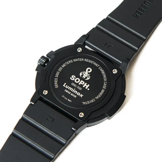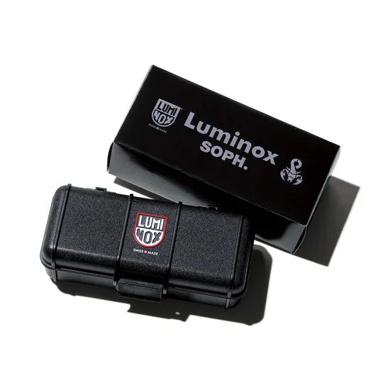 多くの反響があったコラボレーション第一弾で印象的だったのは、ルミノックス独自のCARBONOX+金属プレートが演出するベゼルカラー。ダイバーズウォッチはベゼルの2トーンカラーで印象が大きく変わります。カラーを一新した今回の第二弾モデルもシンプルなデザインと機能美が特徴です。コントラストが効いたベゼルだけでなく、【SOPH.】ロゴを文字盤にデザイン、裏蓋には両ブランドのロゴとエディションナンバー入りとなっています。さらに今回は特製ケースにパッケージングした各300本限定の特別仕様。ケースには軽量且つ耐久性に優れたCARBONOXを使用し、防水・耐圧性能を高めた2重のリューズ構造を採用することで200m/20atmの防水性能によりアウトドアでも活躍できる両ブランドらしいファンション性の高いモデルと言えるでしょう。