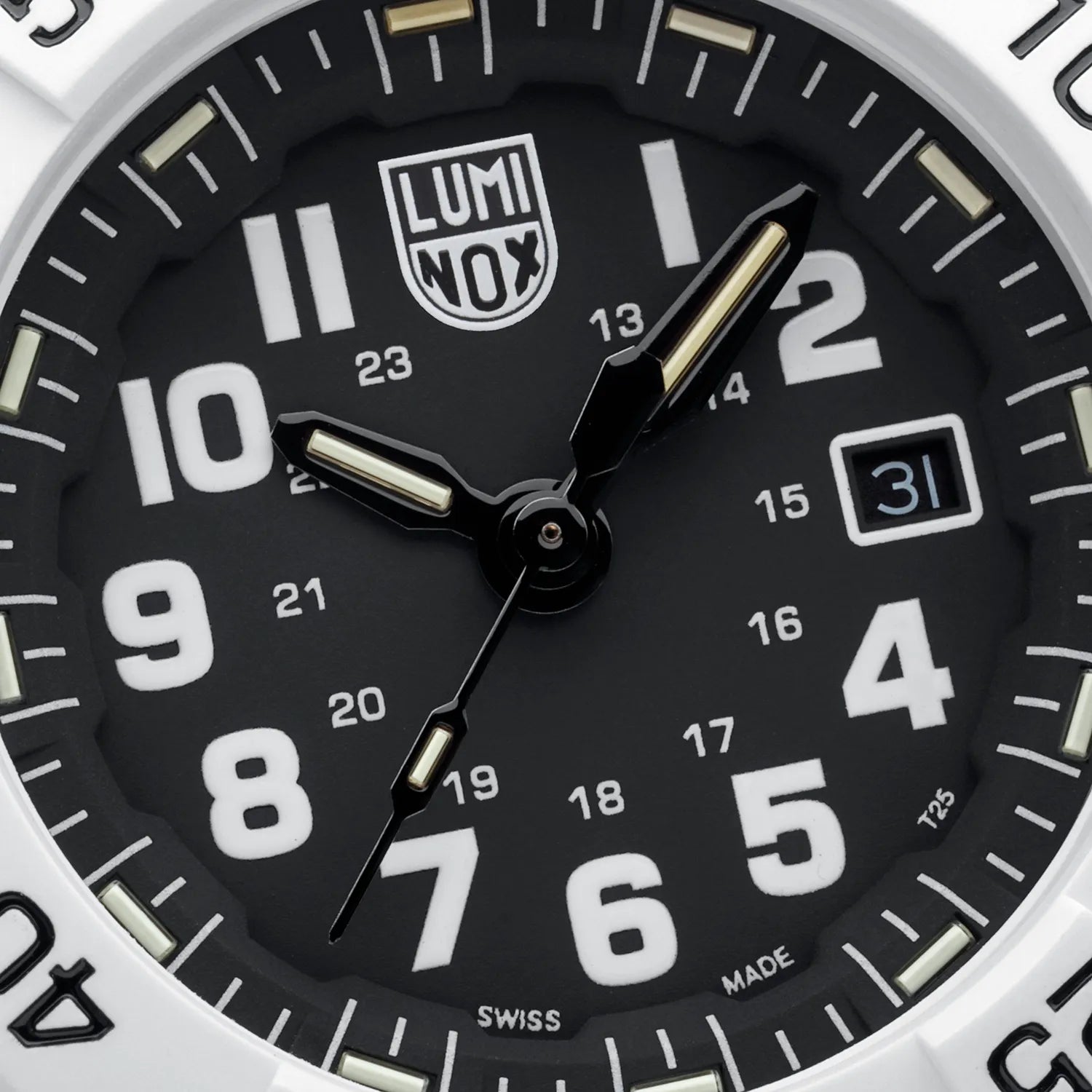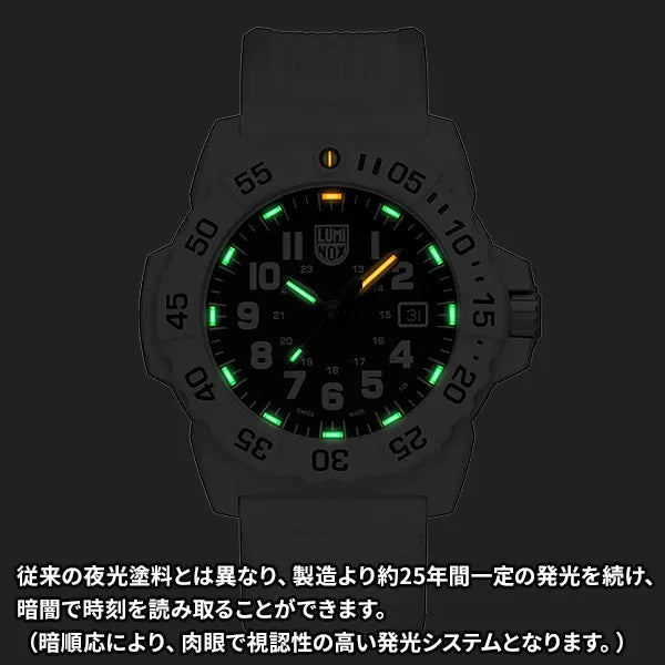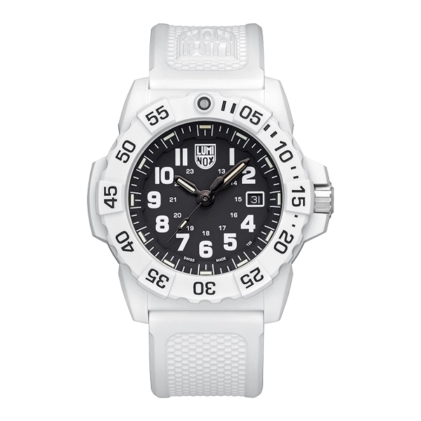 ルミノックスはブランド設立以来、米国海軍特殊部隊ネイビーシールズと協力し、最高水準ともいえる基準を満たす堅牢で信頼性の高いタイムピースを製造してきました。3500シリーズの45mmケースサイズを継承しつつ、ホワイトのファイバーグラス製ケースとベゼルを採用することで、軽量でありながら非常に耐久性の高い構造を実現しています。