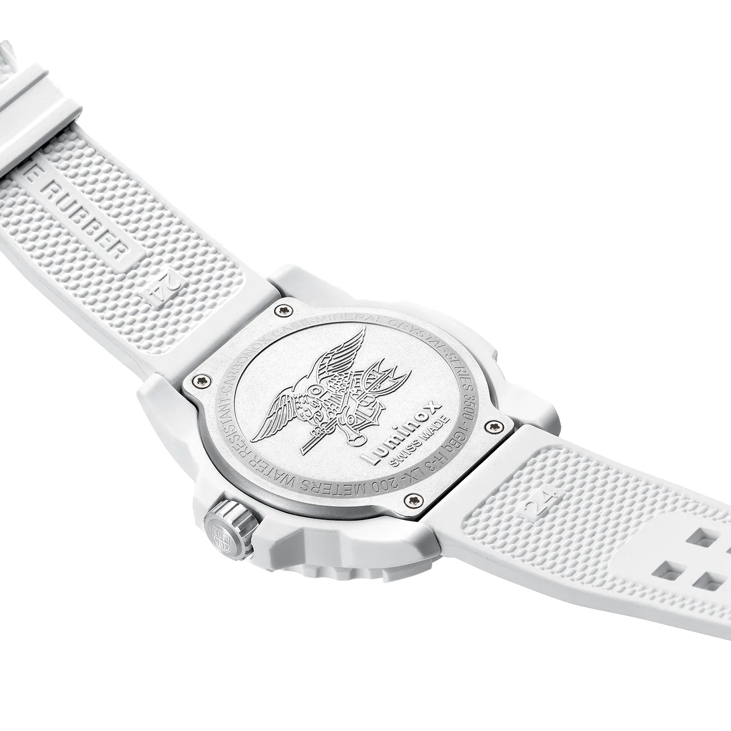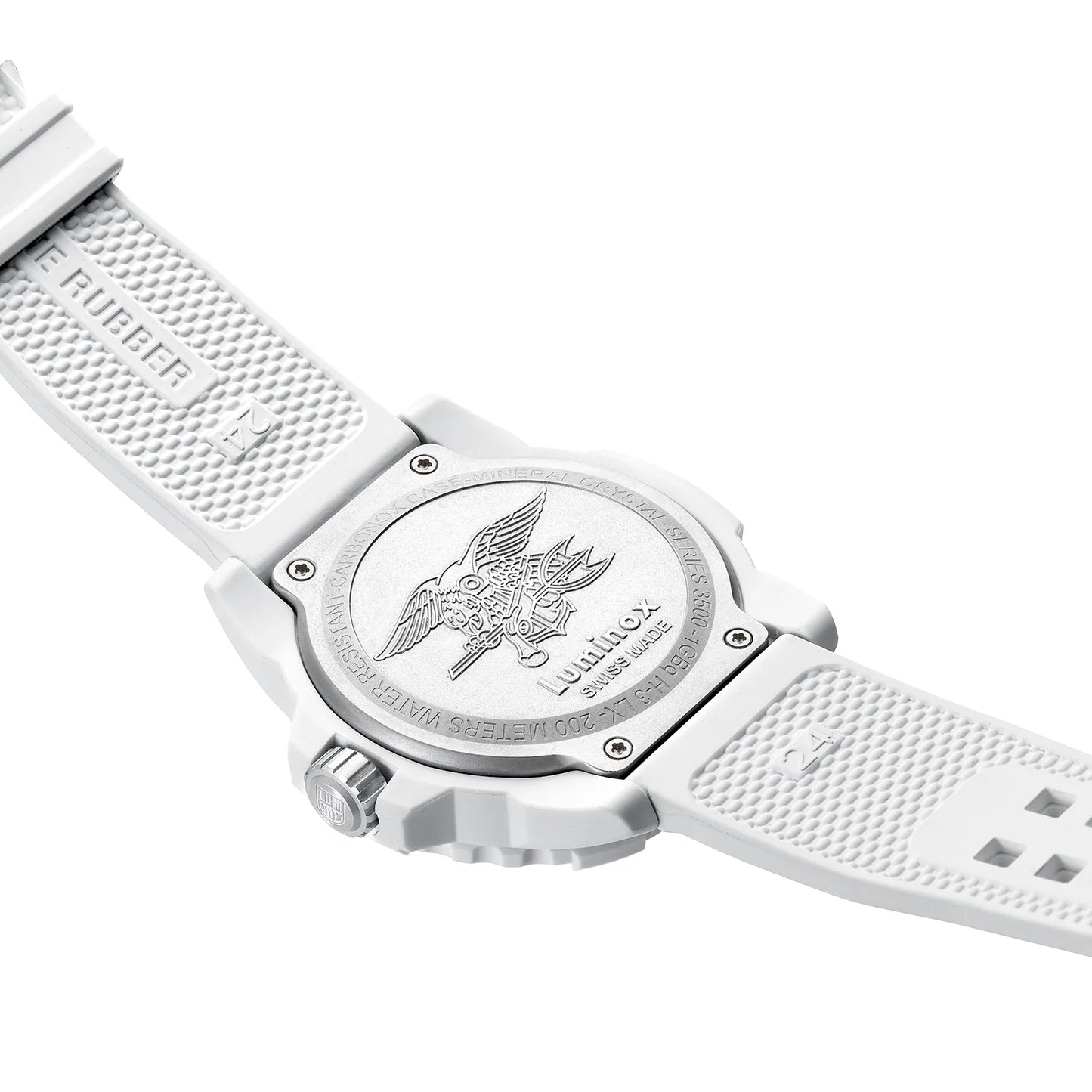 氷に覆われた過酷な環境で活動する隊員のために設計された印象的なホワイトモデル。軽量なホワイトのファイバーグラス製ケースとベゼルという新モデルは、雪山でのカモフラージュや耐久性などによりシールズ隊員だけでなく北極探検家にも最適です。