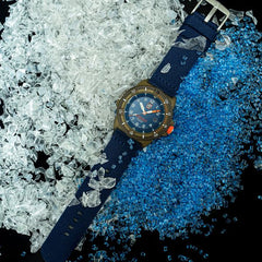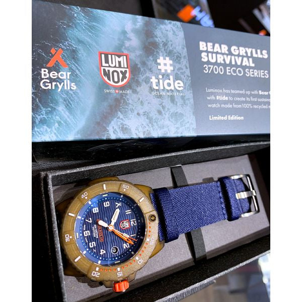 新たに登場するRef.3703は、海洋に投棄されたプラスチック製品の再生に取り組む企業『#Tide』が開発した再生素材を時計本体やベルトに採用。今回は世界限定1500本として登場し、裏蓋にシリアルナンバーと共にベア・グリルス氏と#Tideのロゴを刻印した特別仕様。