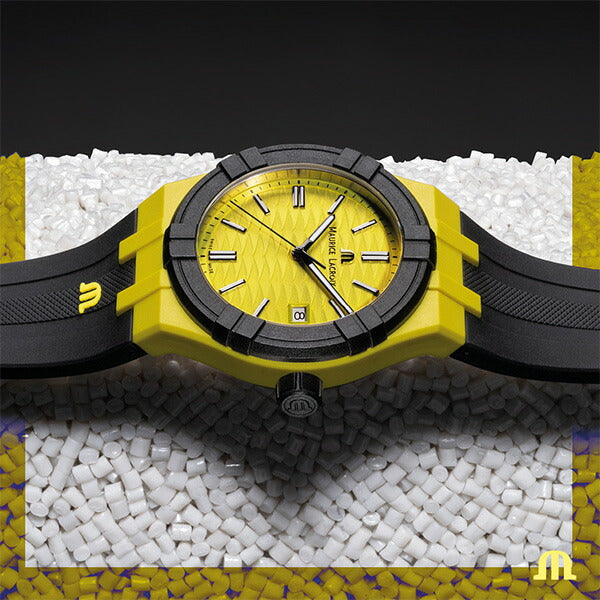 アップサイクルされたオーシャンバウンド・プラスチック ダイアル: 「ジュラ山脈ウェーブ」仕上げのイエローダイアル、3時位置に日付表示 ストラップの素材: アップサイクルされたオーシャンバウンド・プラスチック ブラックラバー イージーストラップ交換システムあり アップサイクルされたオーシャンバウンド・プラスチック バックル |