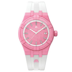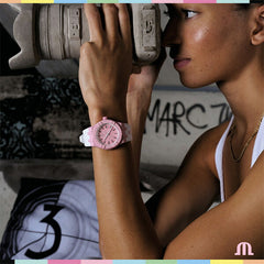 アップサイクルされたオーシャンバウンド・プラスチック ダイアル: 「ジュラ山脈ウェーブ」仕上げのピンク、3時位置に日付表示 ストラップの素材: アップサイクルされたオーシャンバウンド・プラスチック ホワイトラバー イージーストラップ交換システムあり アップサイクルされたオーシャンバウンド・プラスチック バックル |