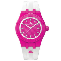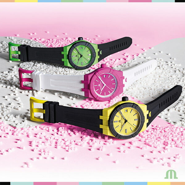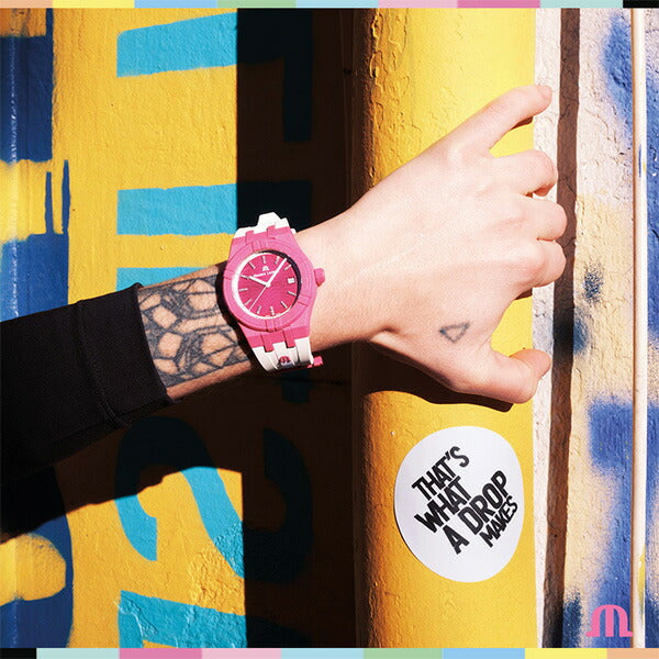 アップサイクルされたオーシャンバウンド・プラスチック ダイアル: 「ジュラ山脈ウェーブ」仕上げのダークピンク、3時位置に日付表示 ストラップの素材: アップサイクルされたオーシャンバウンド・プラスチック ホワイトラバー イージーストラップ交換システムあり アップサイクルされたオーシャンバウンド・プラスチック バックル |