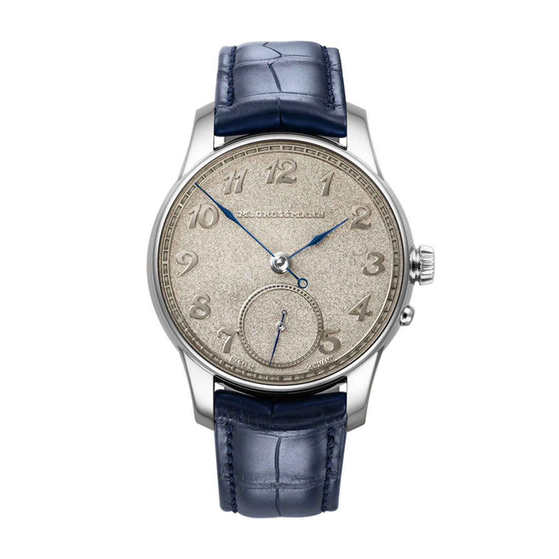 ダイヤルに用いられるジャーマンシルバーは銅・ニッケル・亜鉛の合金であり、ヴィンテージウォッチにも多く採用されています。表面加工をしていないジャーマンシルバーは、歴史ある時計にも見られる独特の色合いを持っています。ダイヤルの立体的なトレンブラージュ装飾がヒストリカルな雰囲気をさらに強めます。アラビア数字のインデックスとスモールセコンドのスケール、そして1875年にモリッツ・グロスマンが用いた「M.GROSSMANN」のロゴがくっきりとダイヤルに浮かび上がります。