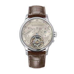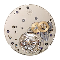 テンプ振動数:18'000振動/時 ストップセコンド機能搭載グロスマン製スリーミニッツトゥールビヨン 時、分、ストップセコンド機能搭載オフセンターセコンド 質量ネジ4本および調節ネジ2本を装着した耐震軸受式グロスマン製テンプ、ニヴァロックス1ヒゲゼンマイ(ブレゲタイプ80番、グスタフ・ゲルステンベルガー案に基づく) パワーリザーブ:約72時間 部品数:245 石数:30 |