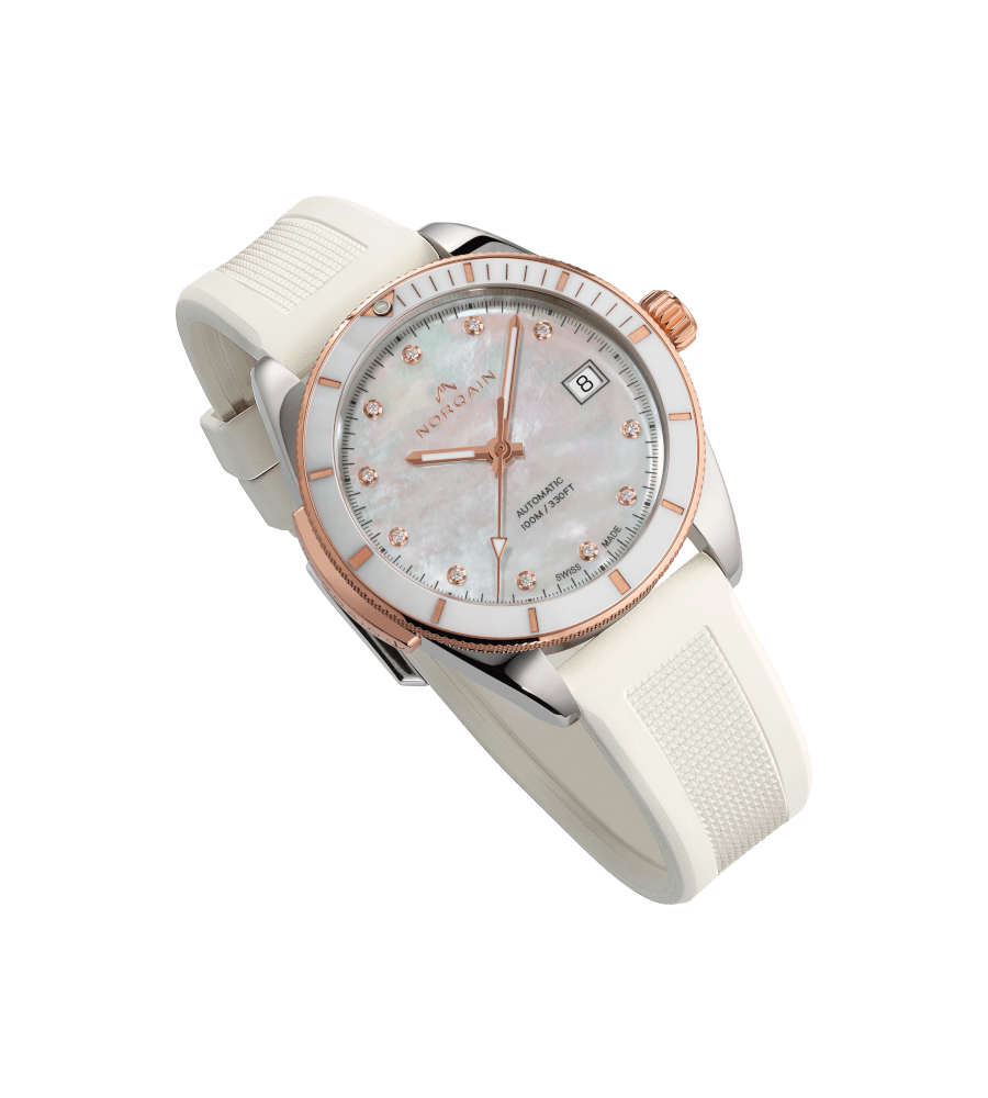 アドベンチャー・コレクションの特徴は、スポーティな力強さ。製造技術の魂を込めた、精緻な刻みを施したベゼル、「NORQAIN」のロゴパターンを施した文字盤をそなえる。