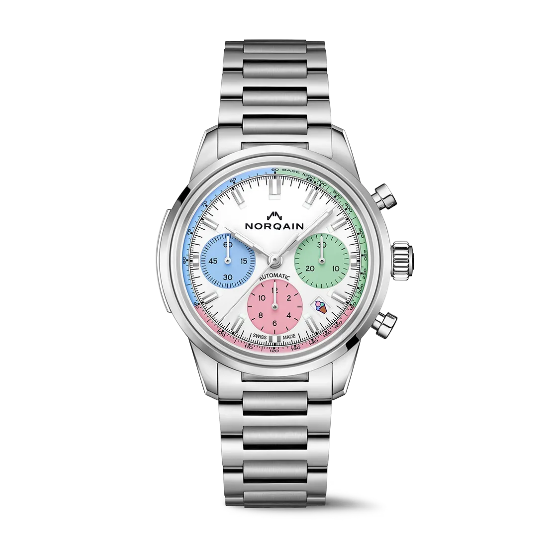 316Lステンレススチール 両面無反射コーティング済みBOXタイプのサファイアクリスタルガラス 「Enjoy Life」のフレーズを含むスペシャルアイスクリームエディションのプリントが施された、サファイアクリスタルケースバック ノルケインロゴの施されたねじ込み式リューズ ケースサイドにノルケインプレートを装着 ダイヤル&ハンズ マット仕上げのホワイトダイアル グリーン、ピンク、ブルーの外周リングに配されたブラックのタキメータースケール 3,6,9時位置にグリーン、ピンク、ブルーのインカウンター ダイヤモンドカットされたインデックス, ホワイトのX1 Super-LumiNova® アイスクリームコーンのアイコンも備えた4時位置と5時位置の間に配置されたカレンダー ノルケインロゴ ダイヤモンドカットされた時分針、ホワイトのスーパールミノバX1 Super-LumiNova® ダイヤモンドカットされたセンター針 ダイヤモンドカットされたインカウンター針 ストラップ ステンレススチールブレスレット |